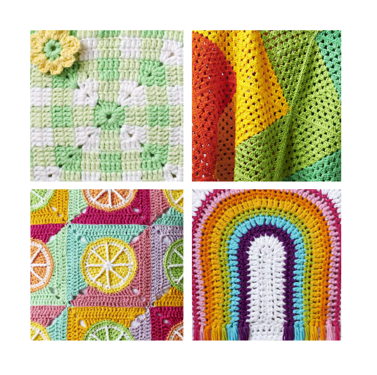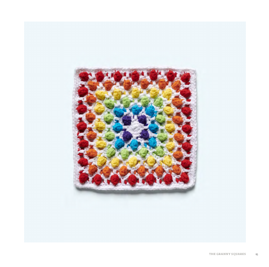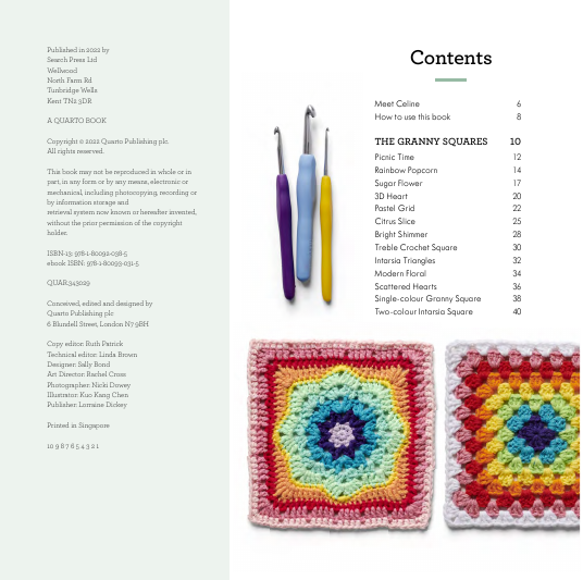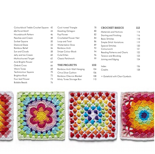Checkerboard 12, Rainbow Popcorn 14, Sugar Flower 17, 3D Heart 20, Pastel Grid 22 Citrus slice 25, Bright Shimmer 28, Dusty Lavender 30, Intarsia Triangles 32, Modern Floral 34, Scattered Hearts 36, Single Colour Granny Square 38, Two-colour Intarsia Square 40, Colourblock Double Crochet Square 42, 60s Floral Motif 44, Black and White 46, Peaches and Cream 48, Sorbet Square 50, Diamond Daze 53, Rainbow Relief 56, Sun and Clouds 58, Jelly and Ice Cream 60, Grapefruit 62, Acid Brights Flower 64, Ombré Cross 66, Warm Tones 69, Technicolour Block 72, Brighton Rock 74, Four-leaf Flower 76, Popcorn puffs 79, Cool-toned Triangle 82, Dazzling Octagon 84, Pop Flower 86, Crocheted Flower Net 88, Loop and Twist 90, Watermelon Slice 92, Rainbow Arch 94, Stripe Colour Block 96, Mix It Match It 98, Cute Kitten 100