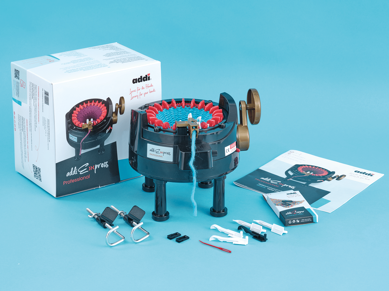 Want to knit decorations, scarves, or socks? Then the small “addiExpress Professional” is perfect. Handy and compact for quickly knitted projects.