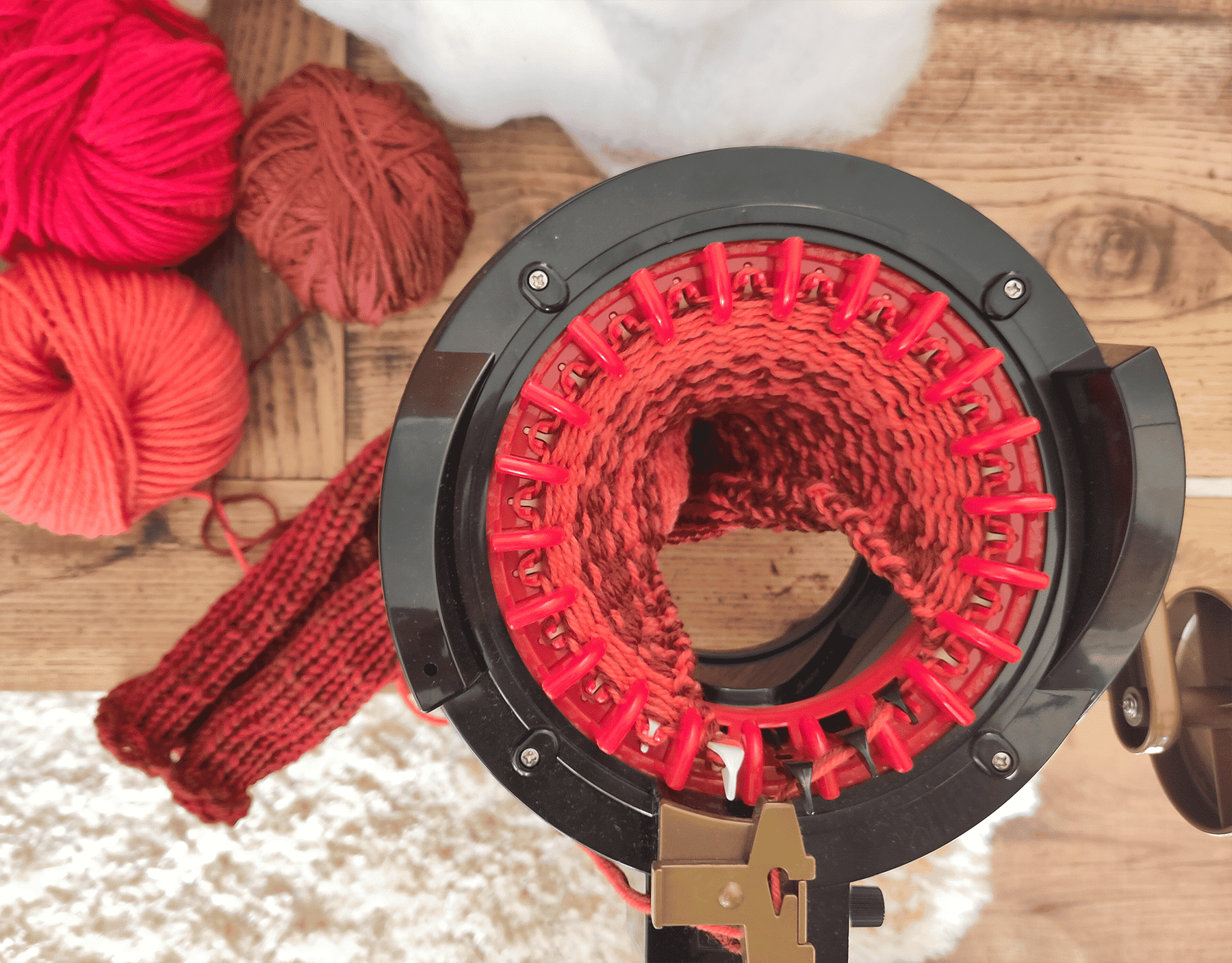 When you knit in the round with the Addi Express Knitting Machine you create a flexible knitted tube with a diameter of approximately 10-15 cm, which has a stockinette stitch appearance on the outside. These tubes can be used to make headbands, wrist warmers, or decorations, for example. The knitting result, the stretch, and the exact diameter of the knitted tube depend on the yarn used and its properties.