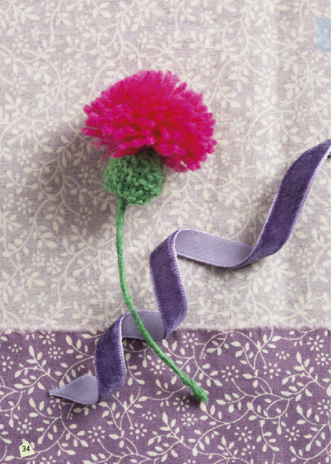 There are 20 projects to choose from, including: an intricate peony; a colourful freesia; a delicate viola; the iconic English rose; and the distinctive Scotch thistle. The projects contain an appealing mix of yarns, colours, techniques and textures, and feature both flat and 3D styles. They can be used as brooches, keyrings, or to decorate purses and handbags. There is also a knitted vase to make for your bouquet.