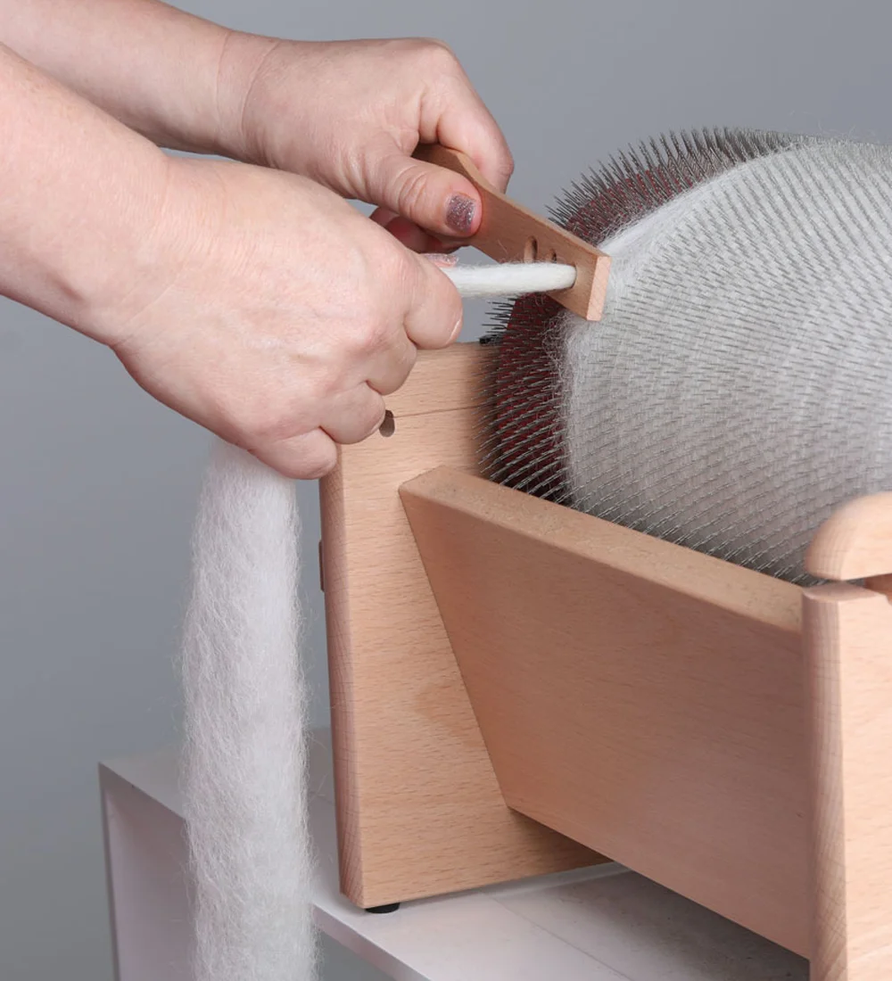Fibre preparation made easy. This carder has two exceptionally powerful motors to enable fleece and sliver to be carded easily and quickly.