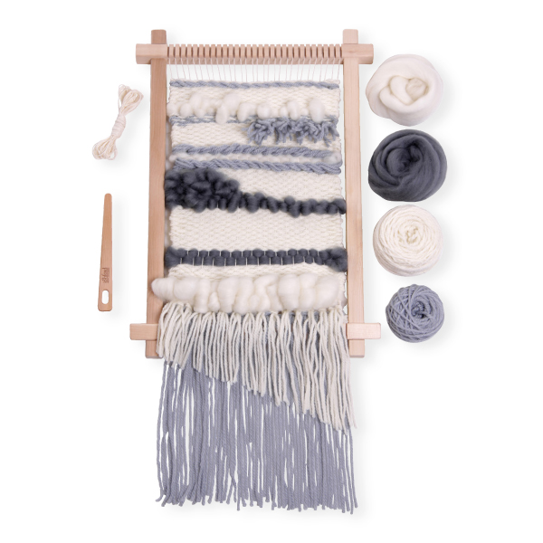 Weaving Starter kit includes: Ashford Weaving Frame, Ashford Weaving Needle, yarn, Ashford fibre for texture, warp thread, dowel for hanging and instructions.