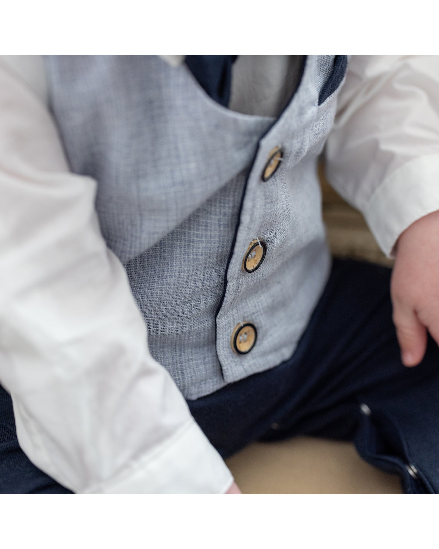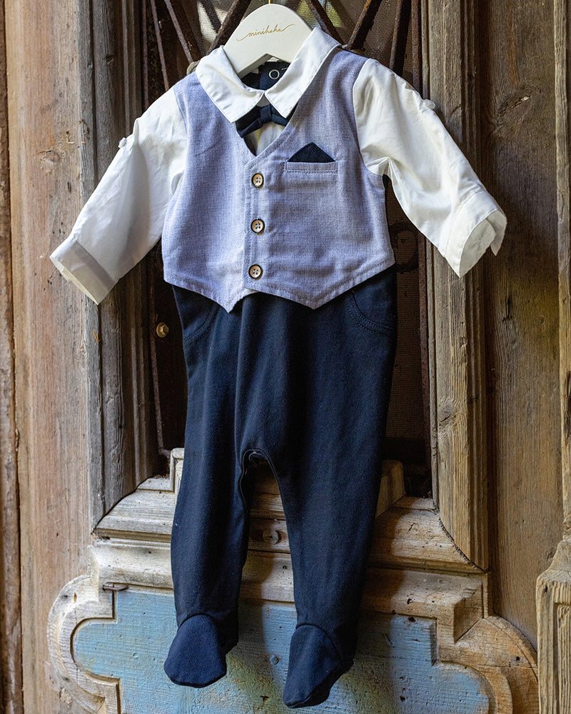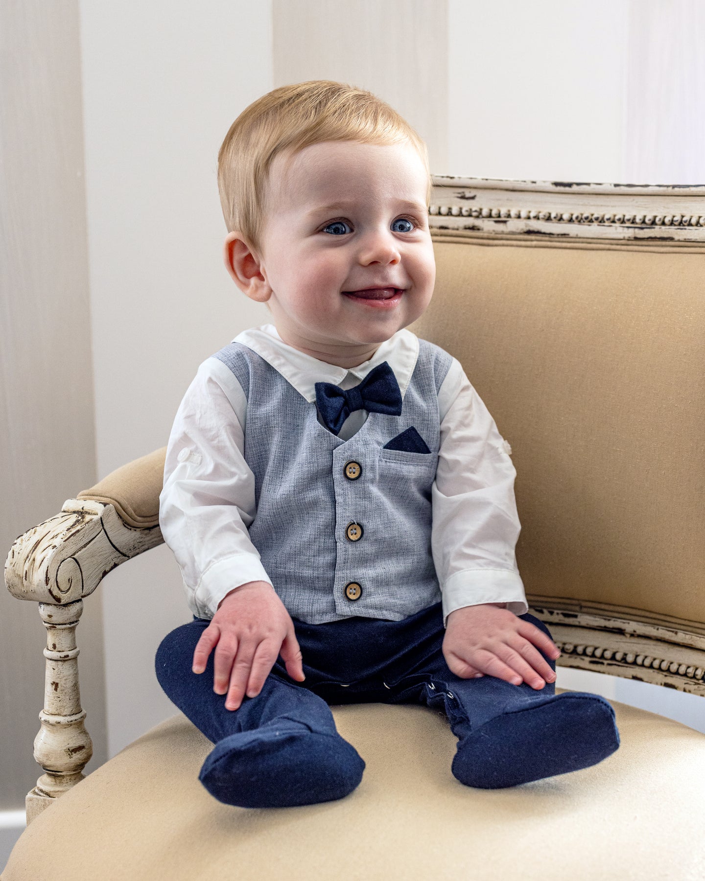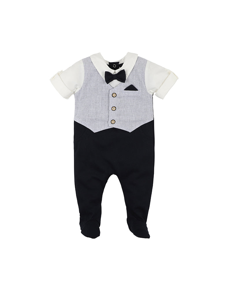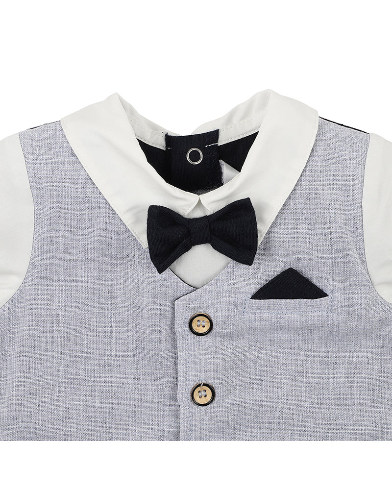 This dressy gentleman romper is all you need for a special occasion, the all in one outfit features a shirt top complete with mock vest, pocket square and bow tie and contrast knit bottom pant keeping baby looking stylish and comfortable.