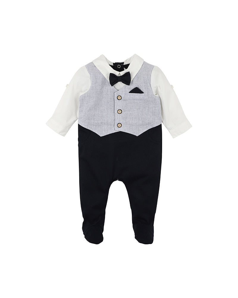 An all in one dressy romper with a grey check built-in vest on a white collared shirt top, ditsy bowtie, and black bottom half with enclosed feet and press stud crotch opening.