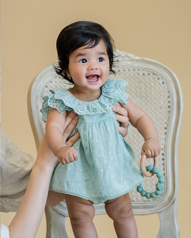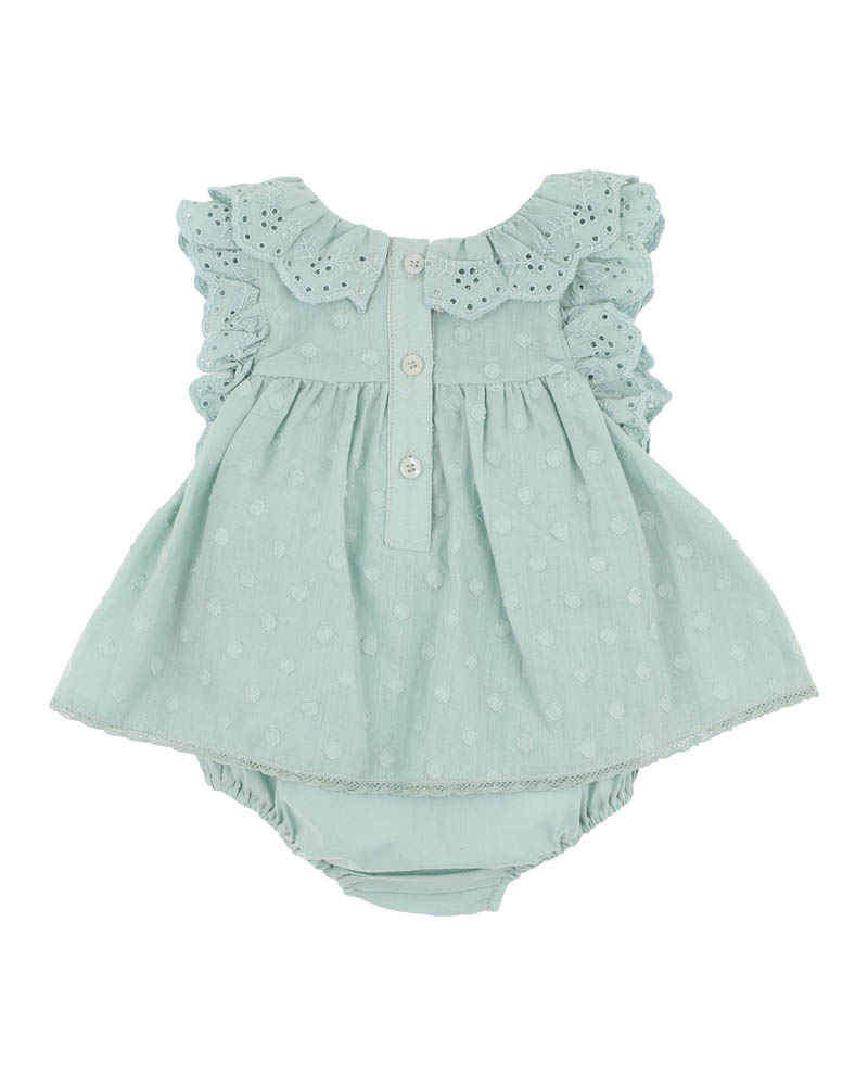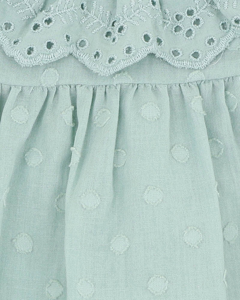 A fresh and feminine addition to your little one’s wardrobe, this sweet overlay bodysuit is crafted from soft, breathable cotton with an all-over textured spot weave. Featuring a beautifully detailed broderie anglaise ruffle at the neckline and sleeves, this one-piece offers cuteness and charm with the comfort and practicality of a bodysuit. Designed in a soft dusky sage tone, it includes an attached bodysuit underneath with elasticated legs and snap closures for easy changes.