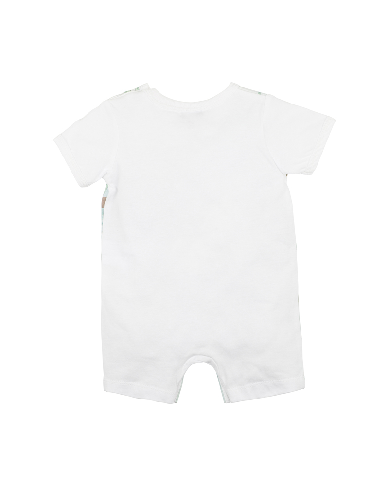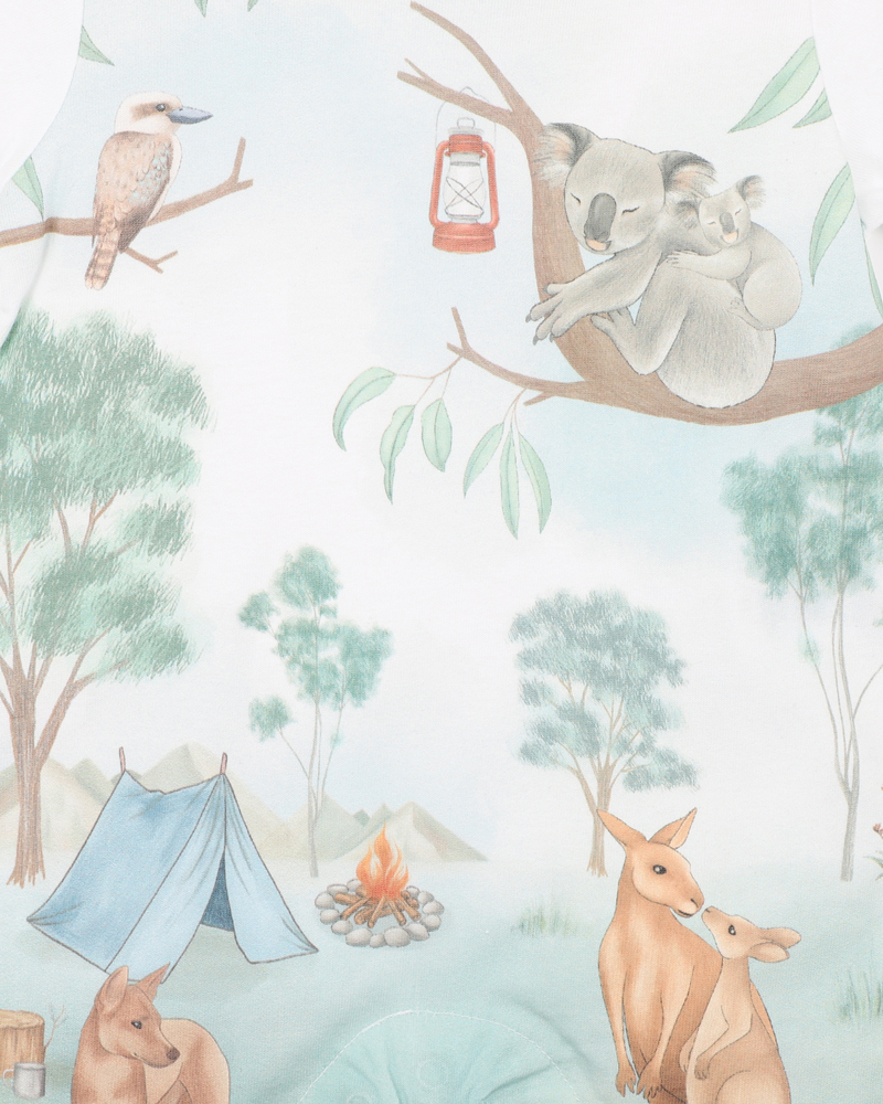 This short sleeve, short leg romper features an outback scene print on the front, a press stud shoulder opening and a concealed press stud crotch opening for ease of dressing.