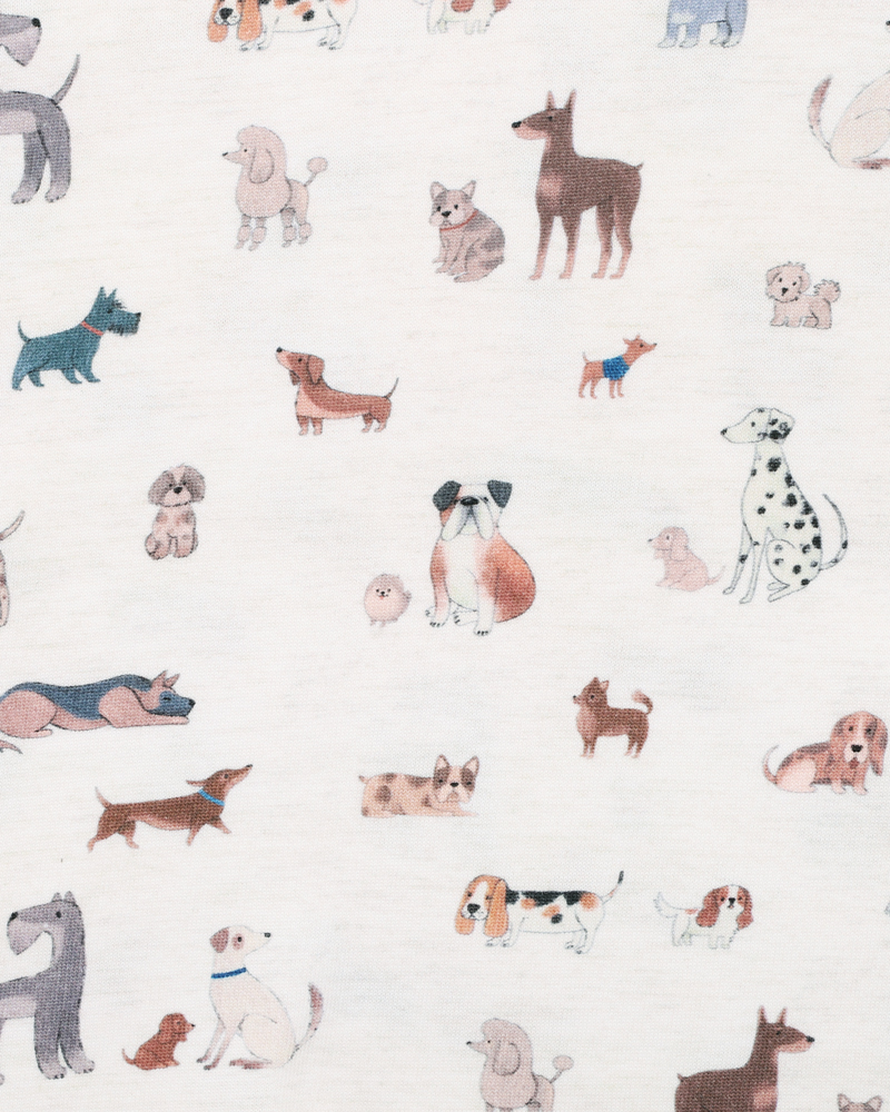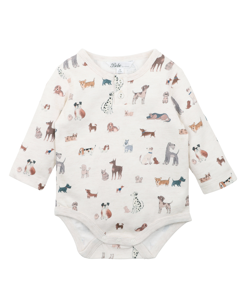 This cute doggy print bodysuit with long sleeves features a front placket button opening making it a great basic for your little one’s Winter wardrobe to wear back with the Austin cord overall for a complete outfit.