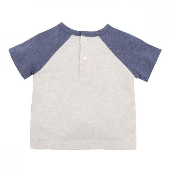 This short sleeve tee features contrast raglan sleeves and neck binding, back button neck opening and a farm yard scene graphic on the front.