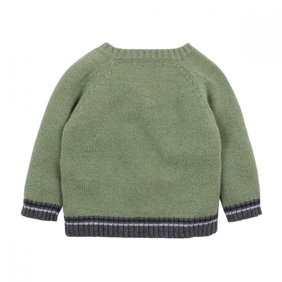This warm and cosy green knitted jumper features a classic cable design, contrast cuff and hem band and a front side neck button opening for ease of dressing.