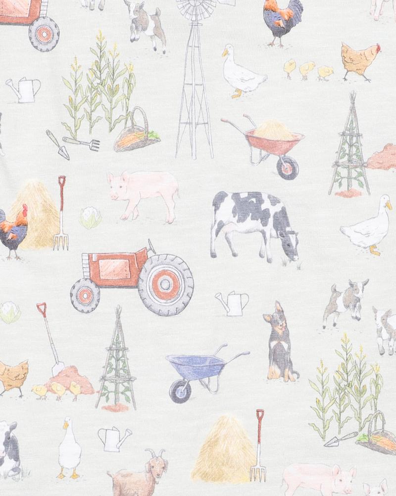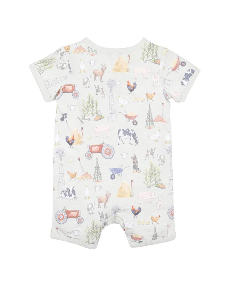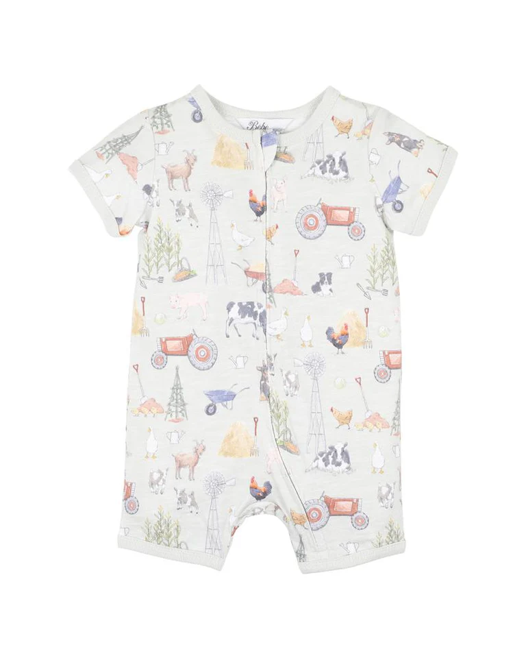 This short sleeve short leg romper features a fun farmyard print, with contrast neck, sleeve and leg binding and a front zip for ease of dressing your little one.