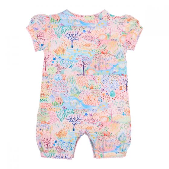 This gorgeous short sleeve wrap romper features press stud opening with bow detail, contrasting cloud and colorful flora print panels, lace trim, and a duck graphic on the front.