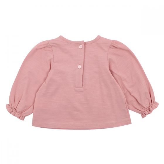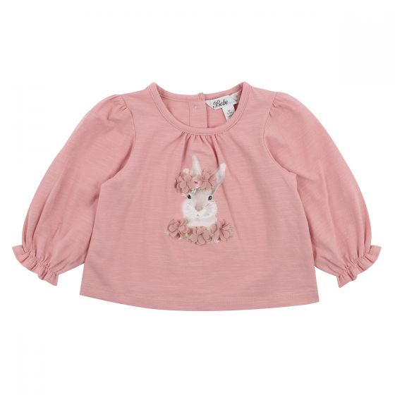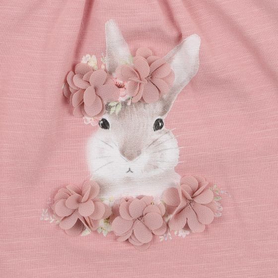 This cute pink long sleeve tee with elasticated frilled cuffs features a cute bunny face graphic with flower garlands appliqued around the image, it is the perfect addition to any little girls winter wardrobe.