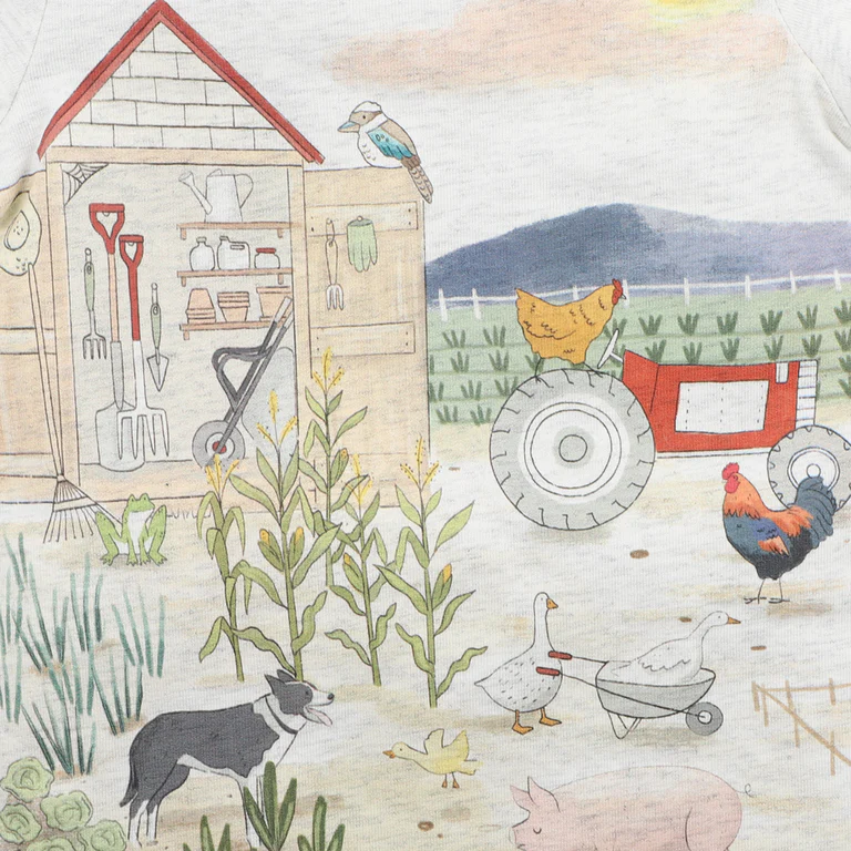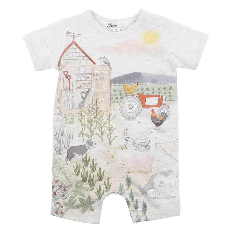 This short sleeve, short leg romper features a fun farmyard print on the front, a button shoulder opening and a concealed press stud crotch opening for ease of dressing your little one.