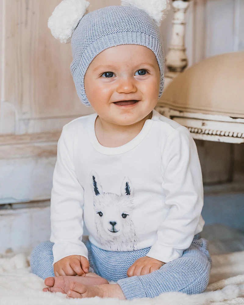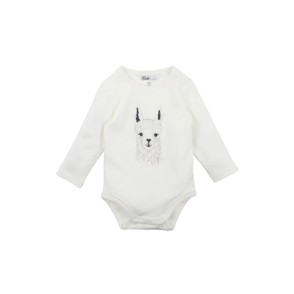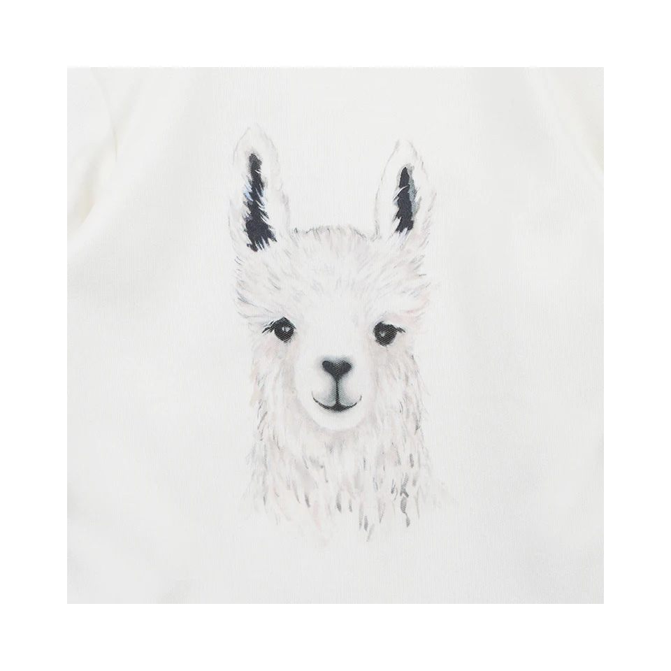 This lovely ivory bodysuit features a sweet llama face graphic on the front.