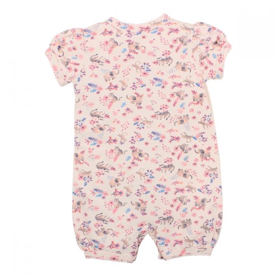 This gorgeous short sleeve wrap romper features a press stud opening with bow detail, contrasting pink and jungle animal print panels, and a floral bouquet embroidery on the front.
