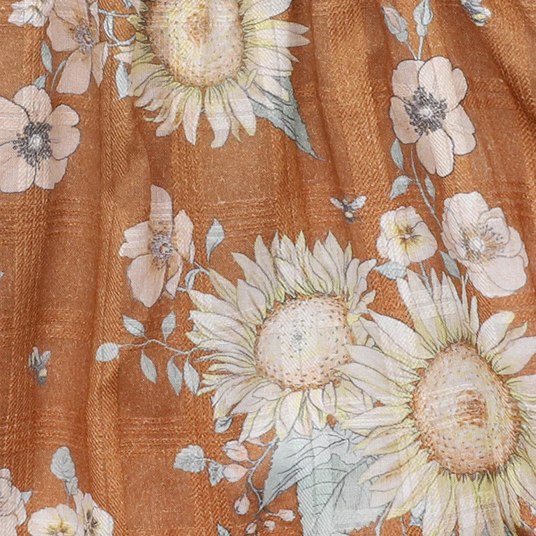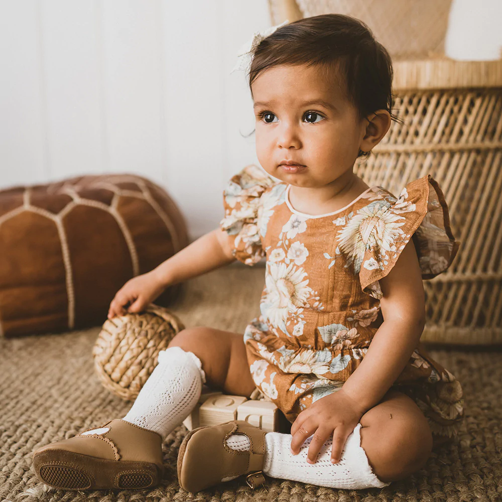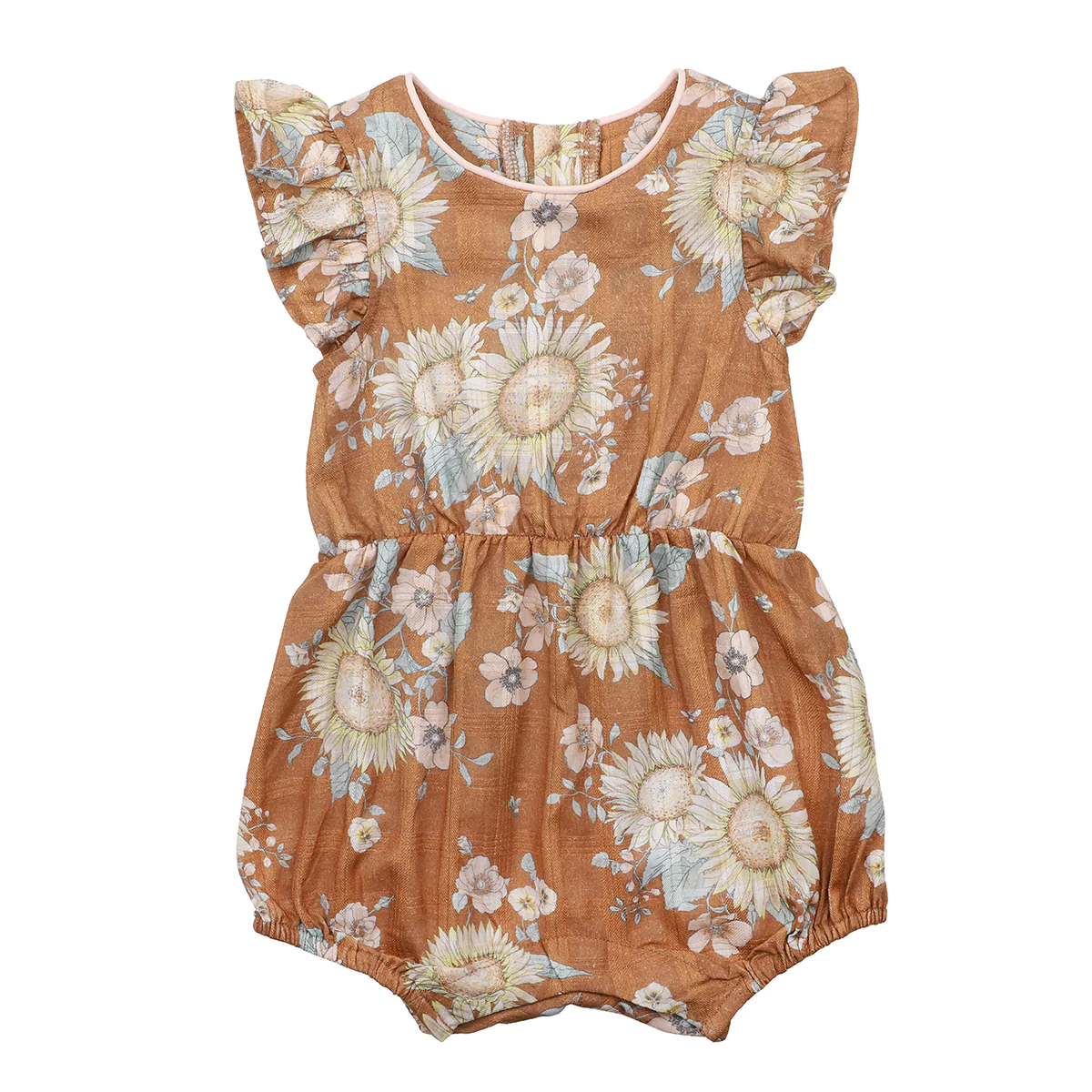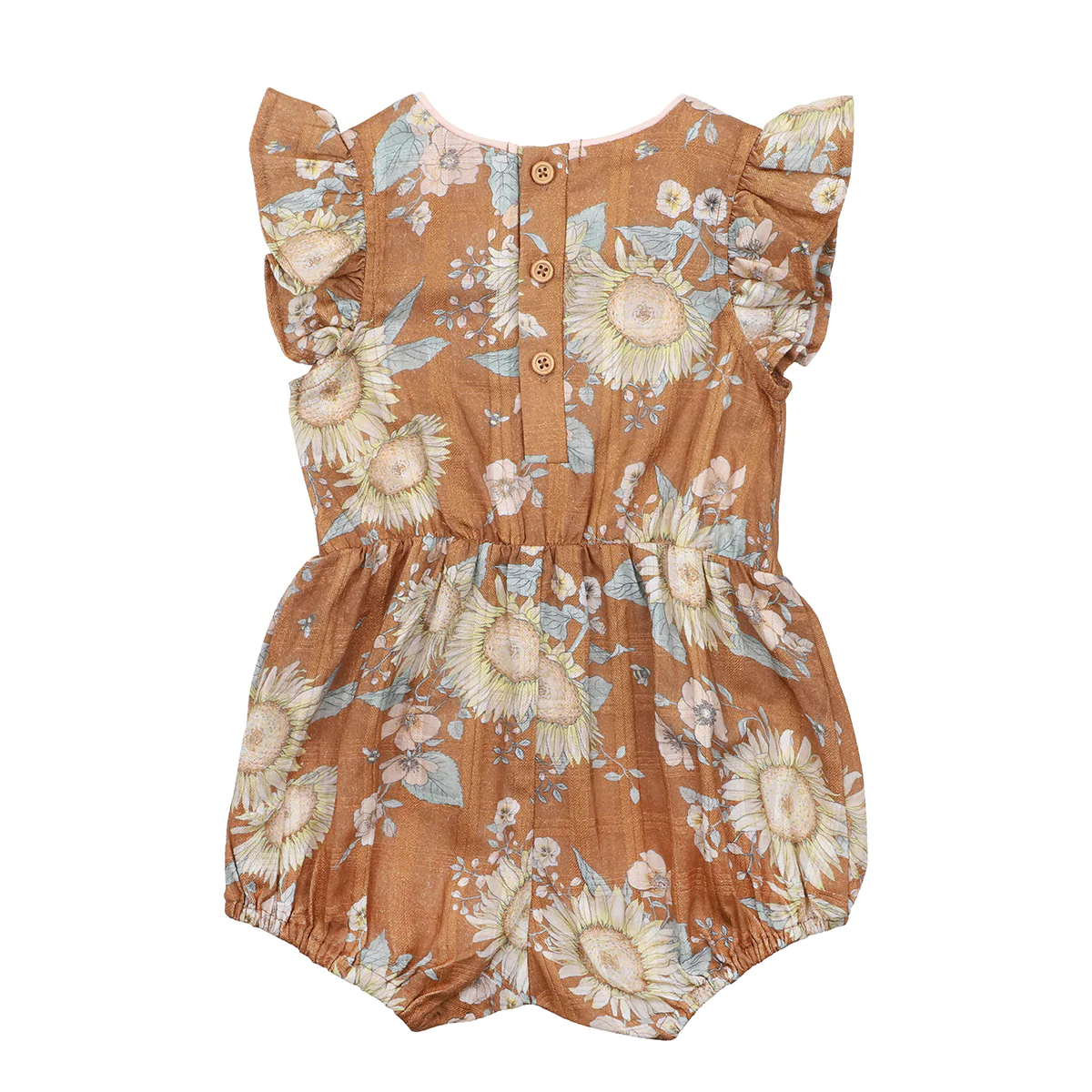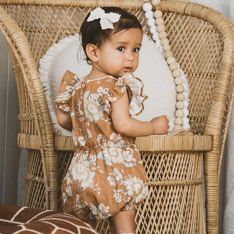 This sweet cotton crosshatch native floral print romper features frilled armholes, contrast piping around neckline, elastic waist for fit and comfort, elasticated legs, back button placket and a press stud crotch opening for ease of dressing.