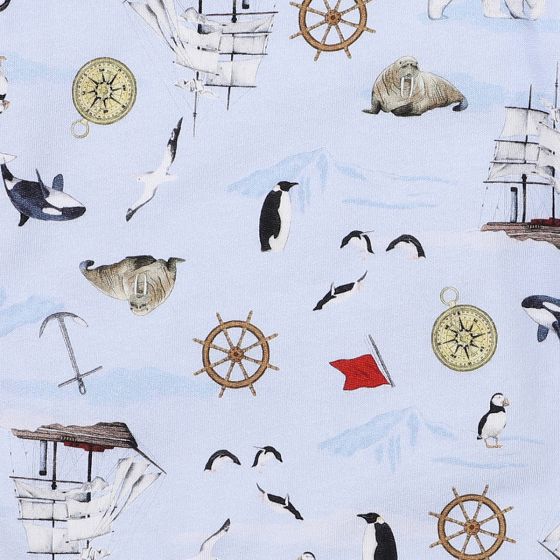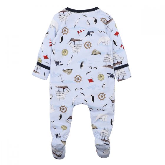This long sleeve romper features a sweet nautical print with contrast navy binding, enclosed feet, built in fold – over cuff mittens and a zip front opening for ease of dressing.