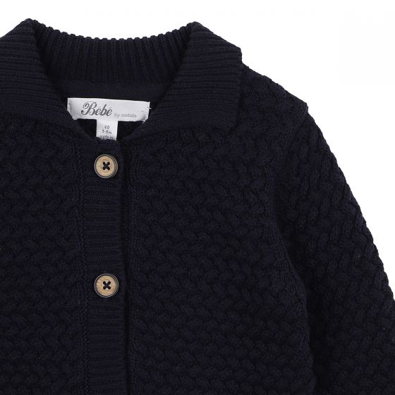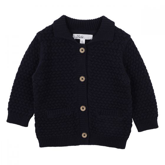 This classic cotton woven cable stitch knitted cardigan featuring a button front, ribbed collar, mock welt pockets is perfect for extra winter warmth when dressing your little one.