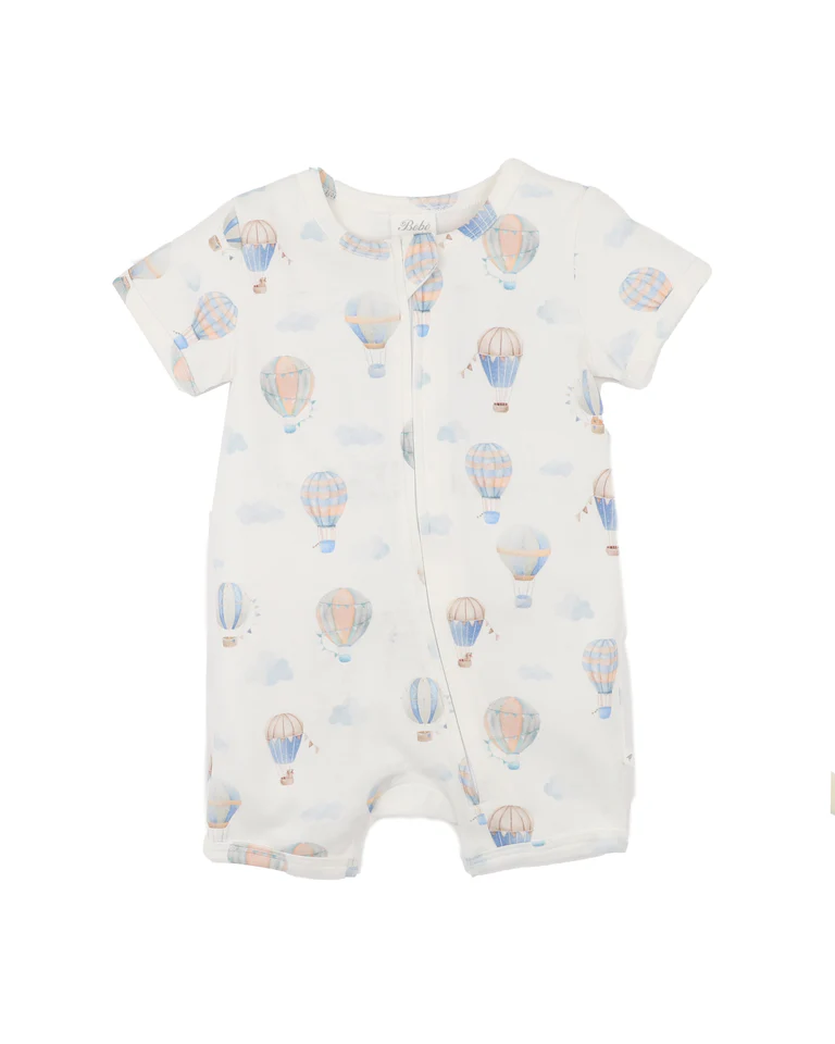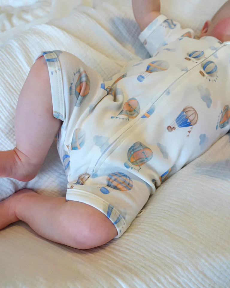 Soar into sweetness with this adorable short sleeve zip romper, featuring an all-over hot air balloon print that captures the whimsy of sky-high adventures. Made from a soft and stretchy blend of 95% Organic Cotton and 5% Elastane, this romper is perfect for everyday comfort and movement. The concealed two-way zip front makes dressing and nappy changes a breeze, while the safety fold at the neck ensures little ones stay comfortable and protected. Whether lounging or exploring, this playful piece makes the perfect companion for warm days and dreamy nights.