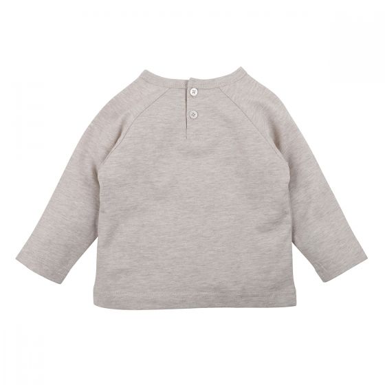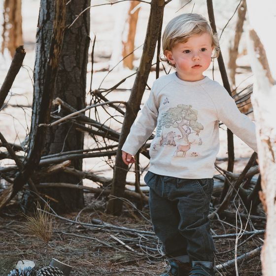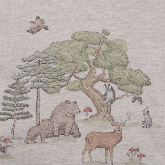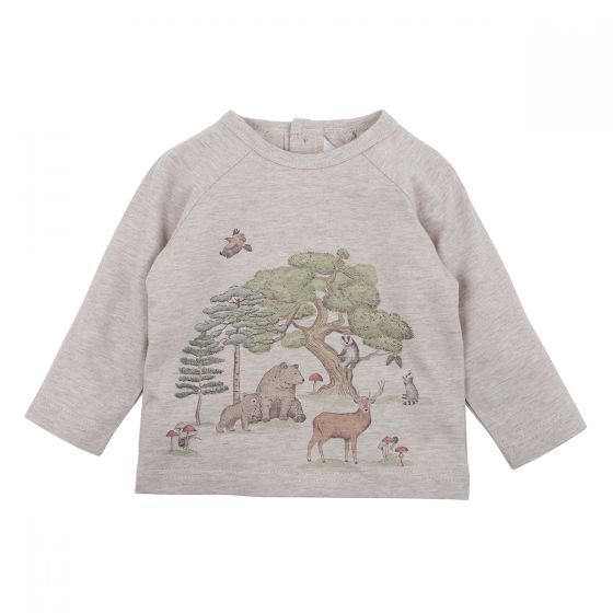 This long sleeve raglan cotton tee features a forest animal scene graphic printed on the front and with a back neck button opening for ease of dressing.