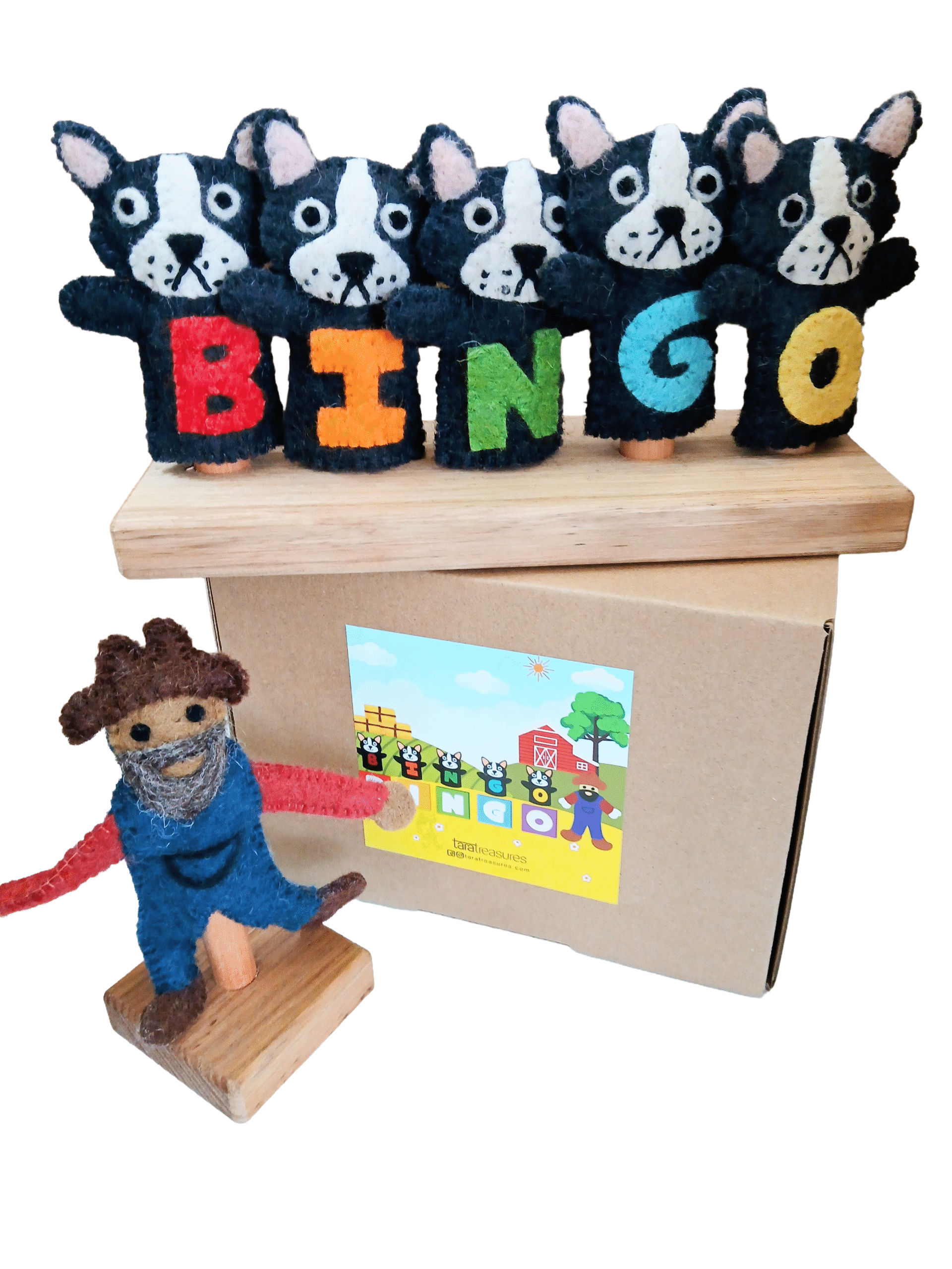 There was a farmer who had a dog, and BINGO was his name-o. A popular folk song that is sung and acted by many children today, this BINGO finger puppet consists of 5 Boston Terrier Dogs and a Farmer.
