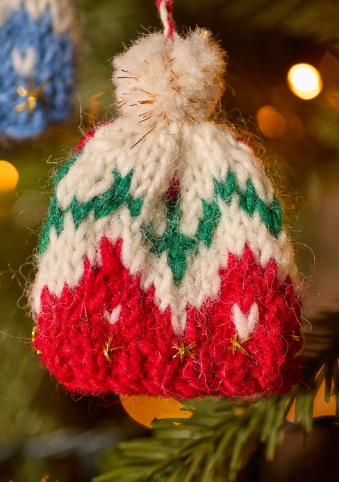Introducing charming, hand-knitted bobble hats in vibrant red and blue varieties. Each hat comes adorned hand embroidered gold stars and a red and white hanging cord, adding a touch of traditional charm to your tree. These petite decorations measure 6 x 2 x 8cm and are crafted from 100% wool, forming part of an innovative and eco-conscious range of sustainable decorations.