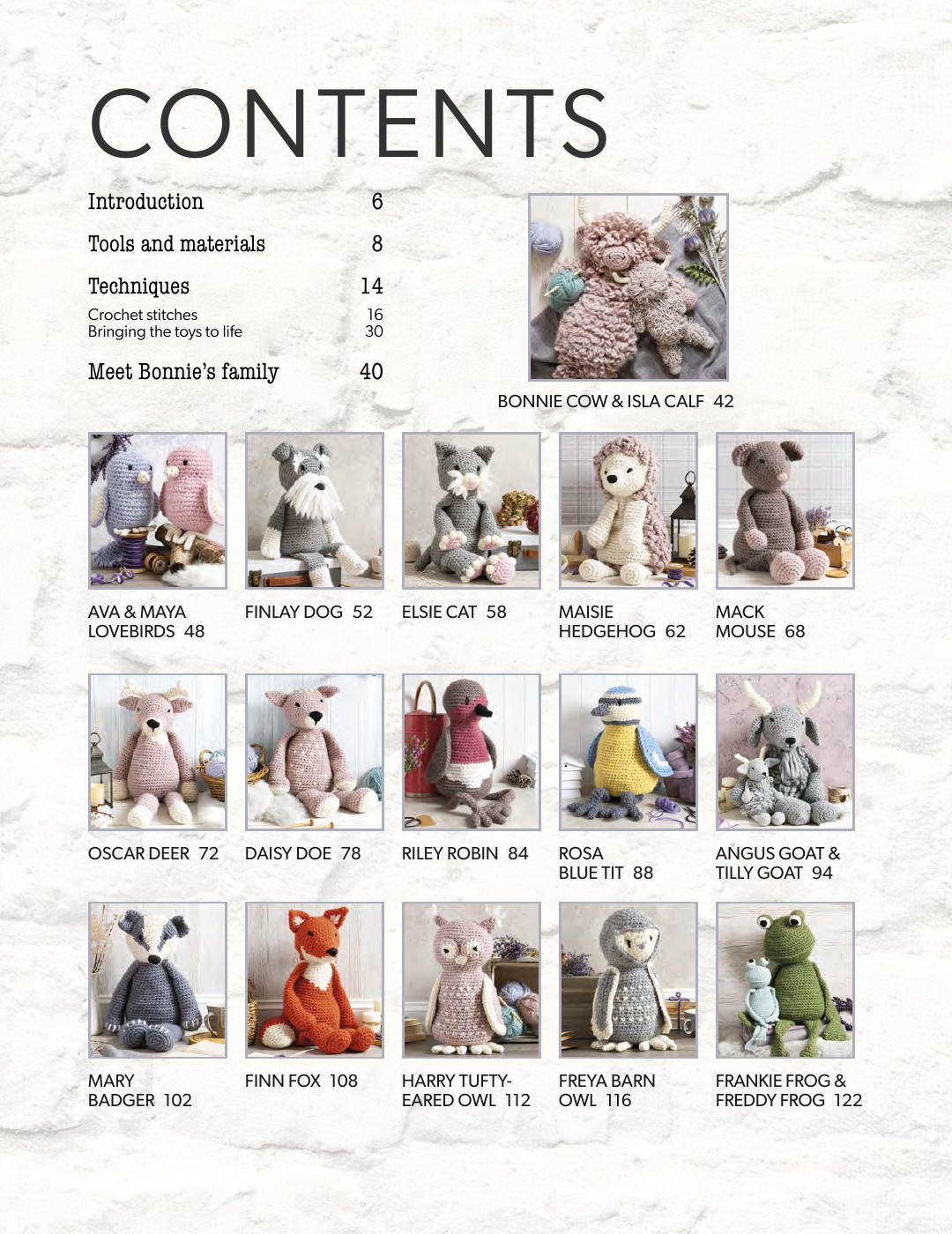 Bonnie Cow & Isla Calf 42, Ava and Maya Lovebirds 48, Finlay Dog 52, Elsie Cat 58, Maisie Hedgehog 62, Mack Mouse 68, Oscar Deer 72, Daisy Doe 78, Riley Robin 84, Rosa Blue Tit 88, Angus Goat & Tilly Goat 94, Mary Badger 102, Finn Fox 108, Harry Tufty-Eared Owl 112, Freya Barn Owl 116, Frankie Frog & Freddy Frog 122