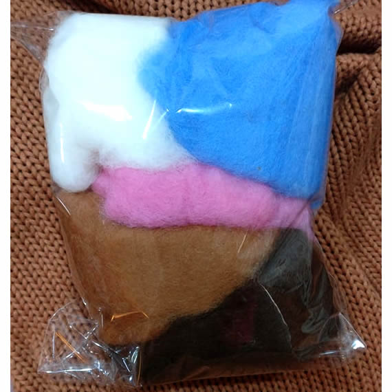 A blend of New Zealand carded wools 27 micron. 20g of five colours: natural white, september (blue), bark, baby (pink) & cinnamon.