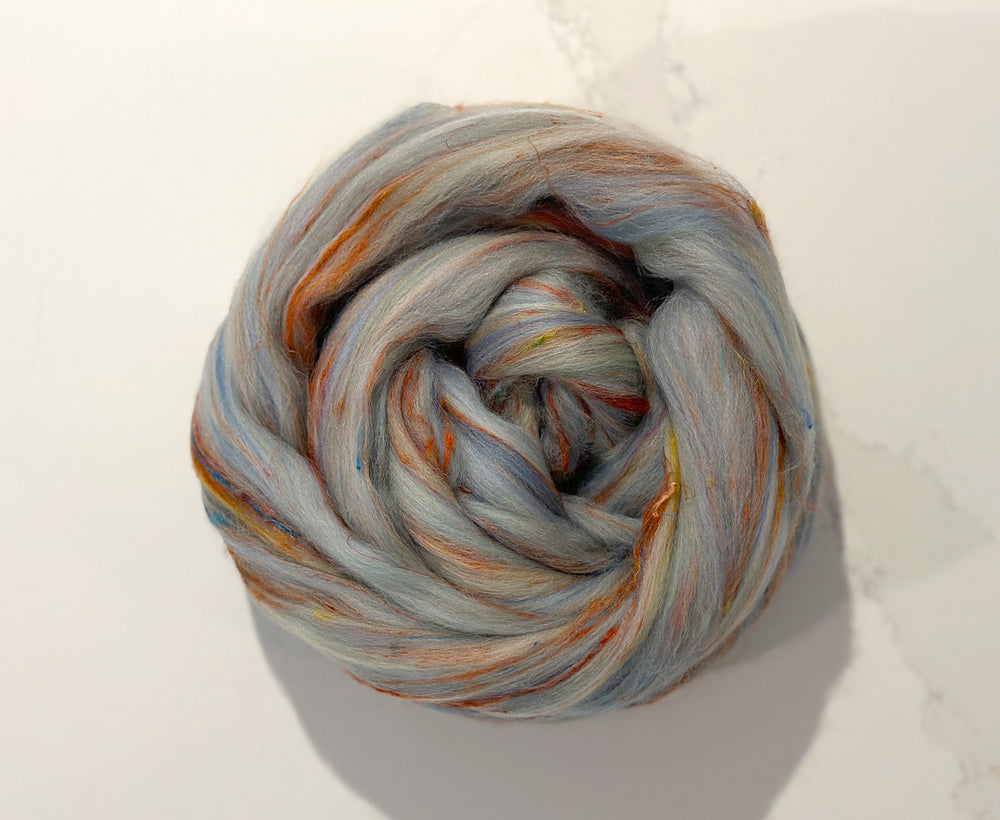 I’m very new to spinning, but this was a pleasure to work with. Very soft against the skin. The pops of colour from the silk appear frequently and the neps provide an interesting texture.
