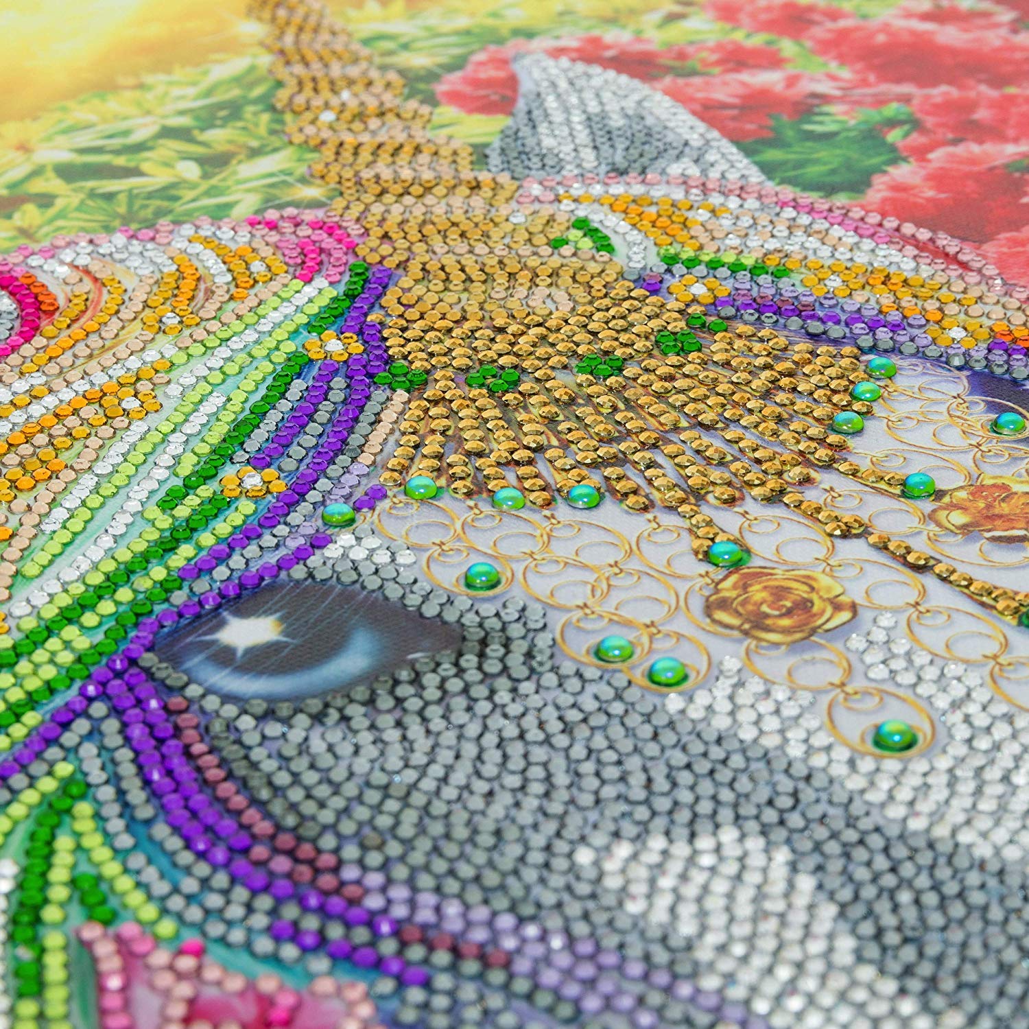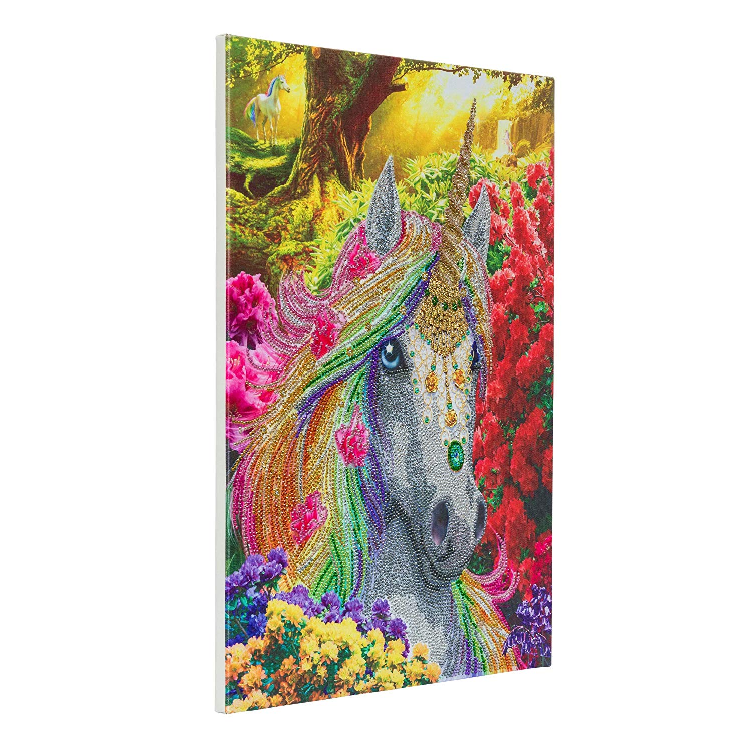 Craft Buddy D.I.Y. Crystal diamond art kits take the concept of our original product (the crystal craft greeting cards kits) a step further, by enabling you to create beautiful art to decorate your office or home or to give as a handmade gift! Each design has a numbered, adhesive template. This charming design template, “Unicorn Forest” depicts a beautiful bejewelled rainbow unicorn surrounded by flowers, a wise old tree and other forest unicorns in the distance.