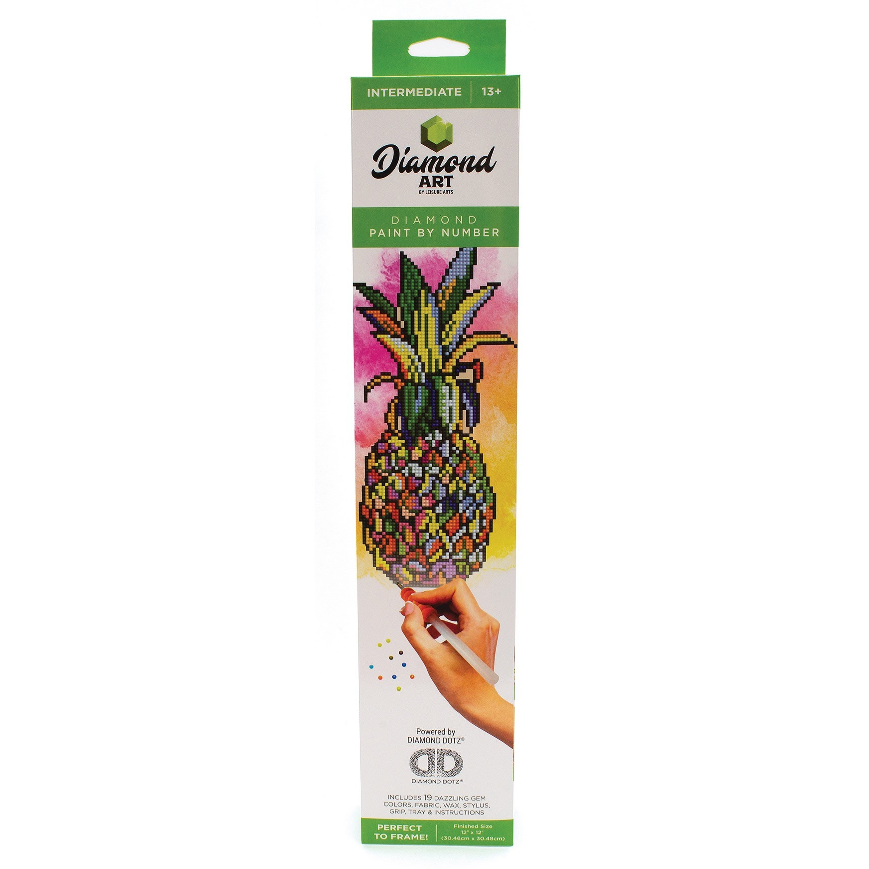 Elevate the classic fruit painting when you dazzle this Pineapple Diamond Painting. Start diamond painting with Diamond Art by Leisure Arts, powered by Diamond Dotz! Paint with beautiful 13 faceted diamonds onto high quality color printed fabric, fashioning your own shimmering artwork to decorate your wall. Place your gems on the pre-printed adhesive chart and see the sparkling results. Using easy-to-follow instructions and handy tools like a comfort grip stylus and wax caddy, you can dip, dot, and dazzle with diamonds. Add a little texture to your space with the electric yellows and greens in this Pineapple Diamond Art kit.