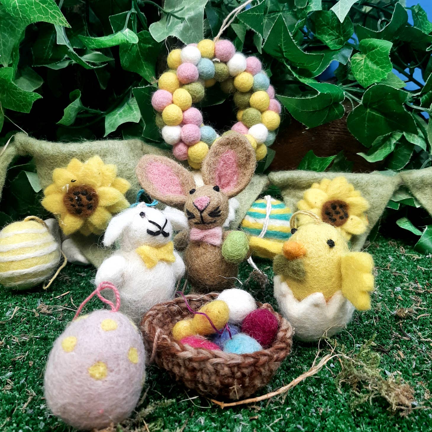 This adorable miniature trio includes all your favourite Easter faces, a Lovely Lamb, Bouncing Bunny and a Chirpy Chick – all dressed in their best Easter bow ties! This set includes one of each of these beautiful besties, perfect for hanging on the Easter tree or for an alternative Easter gift. Each little decoration has been handcrafted using traditional needle felting and wet felting techniques, with hand stitched detailing to bring them to life.