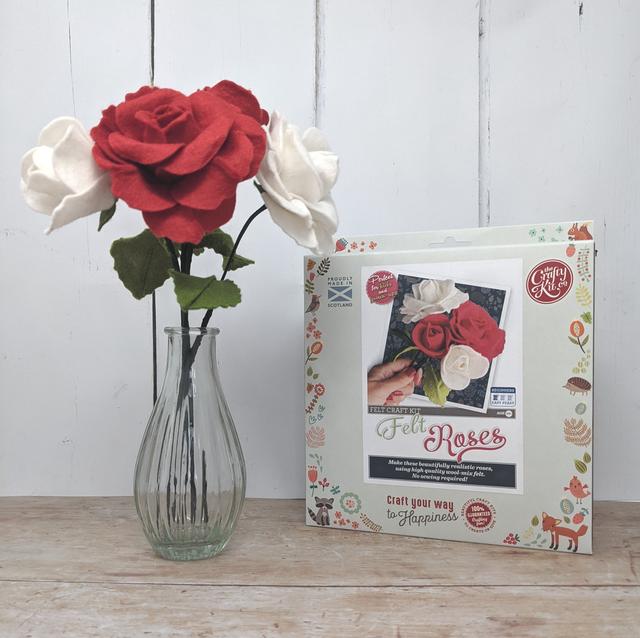 The Crafty Kit Company’s Felt Roses Craft Kit contains materials to make truly realistic looking everlasting flowers! This kit is suitable for beginners, and includes wool mix felt fabric, florist stems, florist tape, step by step colour instructions and templates.