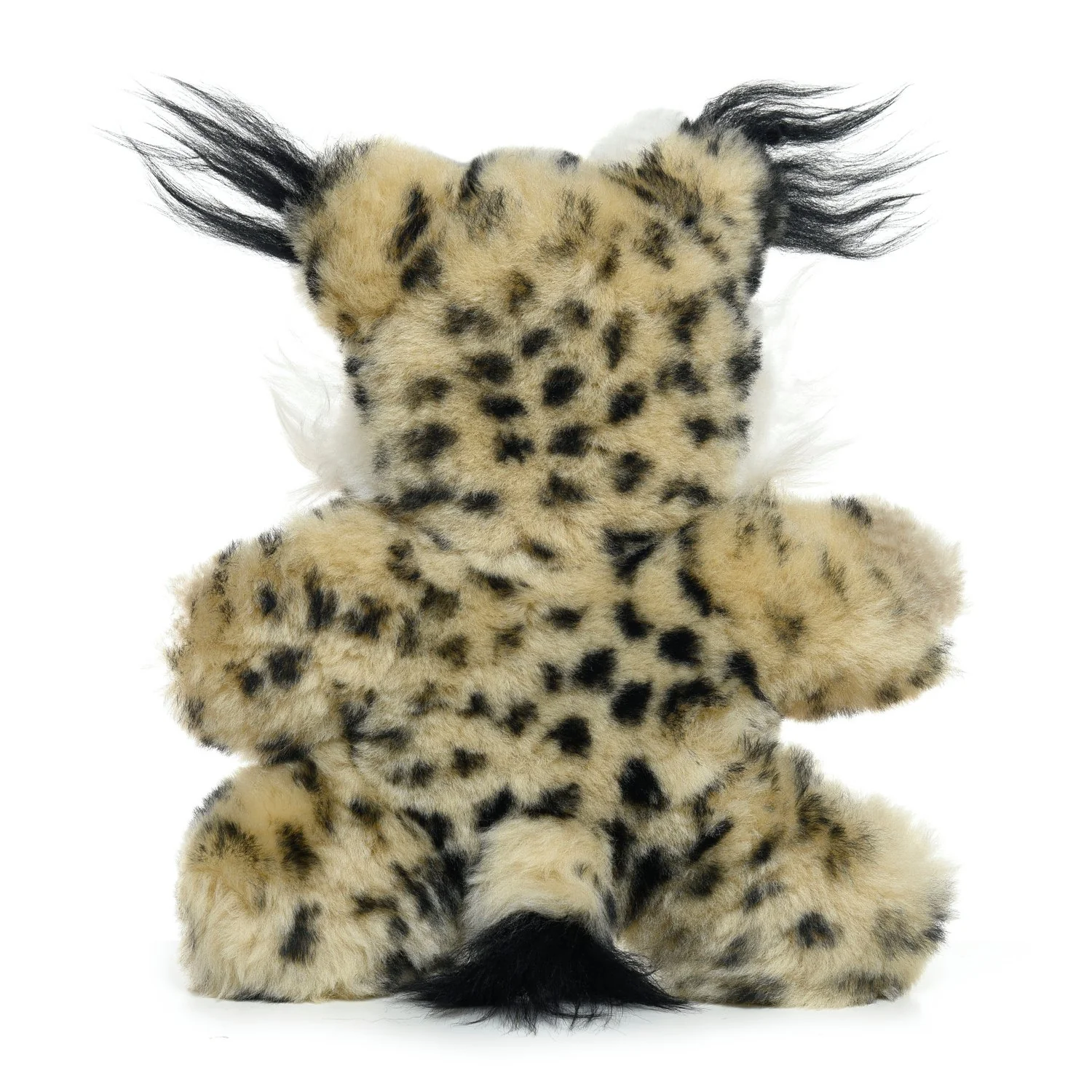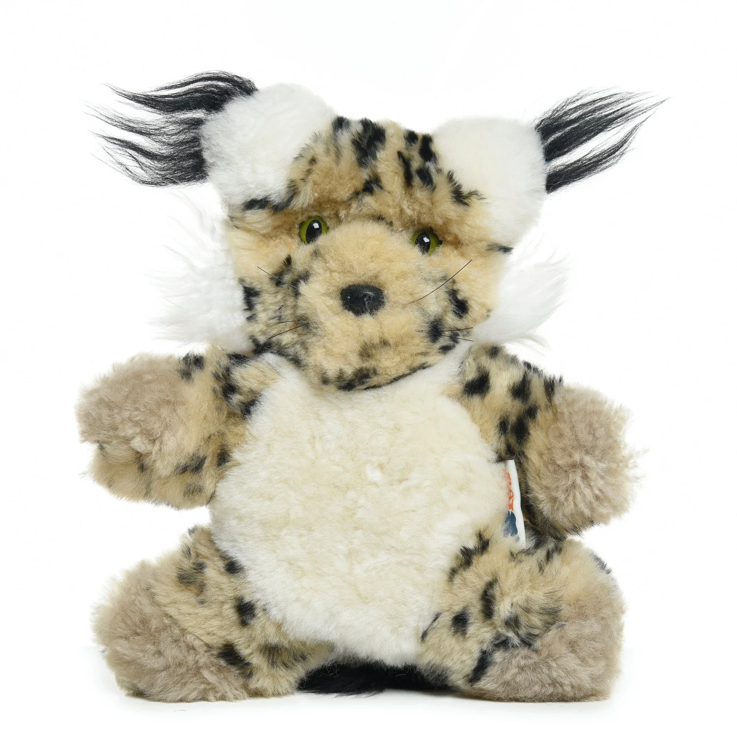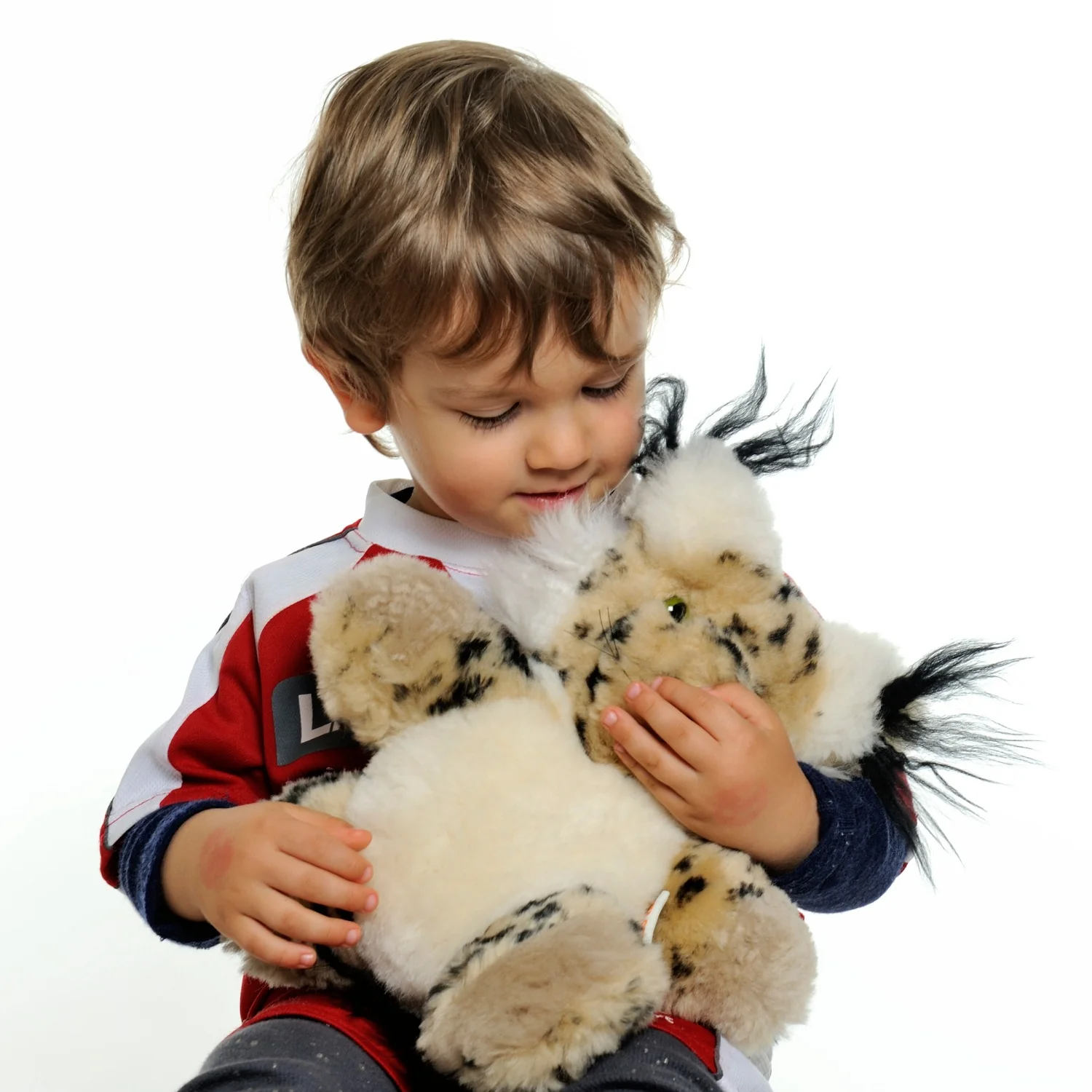 Lola is designed and handmade in the shape and colours of an Iberian lynx found in the wild. Your baby and child will bond with Lola, their sheepskin comforter, and you’ll find it hard to separate them. Your baby and child will love, respect, and gain empathy for Iberian lynxes, becoming passionate about preserving wildlife and their environment. We spent a considerable amount of time meticulously creating Lola to resemble an Iberian lynx in the wild. Her tan body has been overprinted with black rosettes, which are a mark of lynxes and appear on her back, face, parts of her arms, legs, and snout. Her stomach and the front of her ears are white. She has long white fur tufts around her cheeks. Her ears have long black fur tufts, which define the lynx. Some scientists believe lynxes use their long hairs to detect things above their heads when they move around at night. Lola has beautiful, engaging green eyes, and a black Iberian Lynx nose.