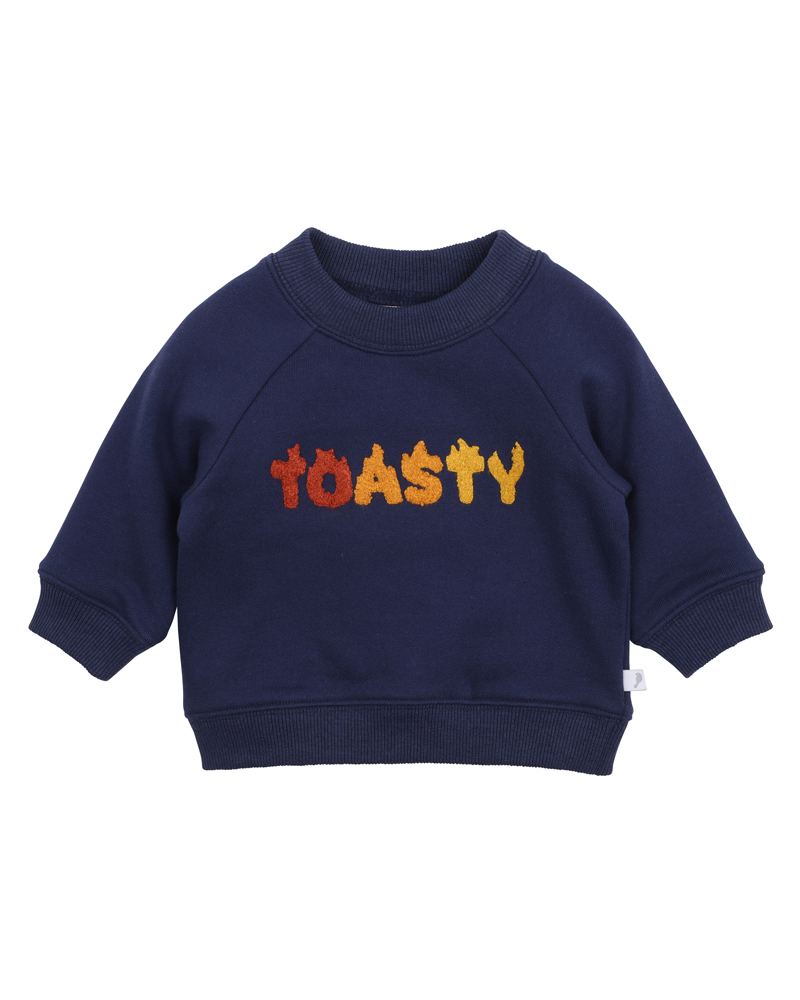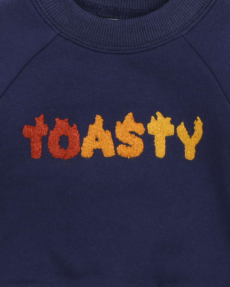 This navy French terry sweat top with a “TOASTY” embroidered boucle graphic is the perfect winter wardrobe addition offering a stylish element which can be layered for added warmth. Match back with the Boys pull on jean or the Boys tan twill pants for a complete outfit choice.