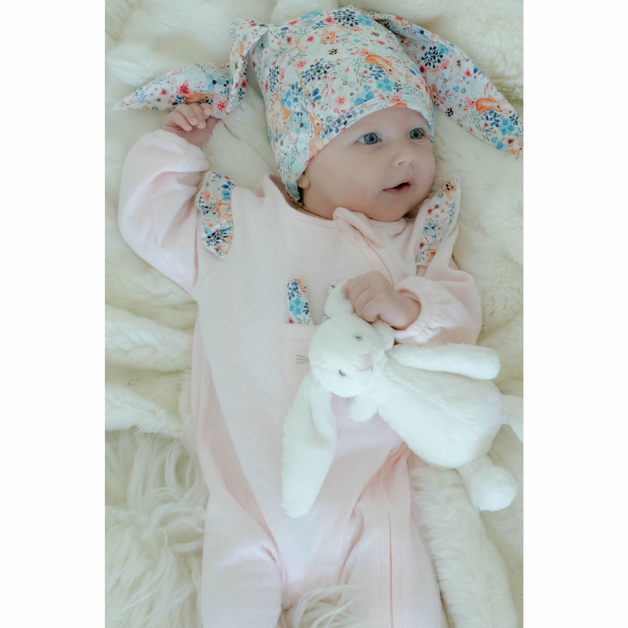 This super-cute beanie features long bunny ears with a fluffy bunny tail on top.