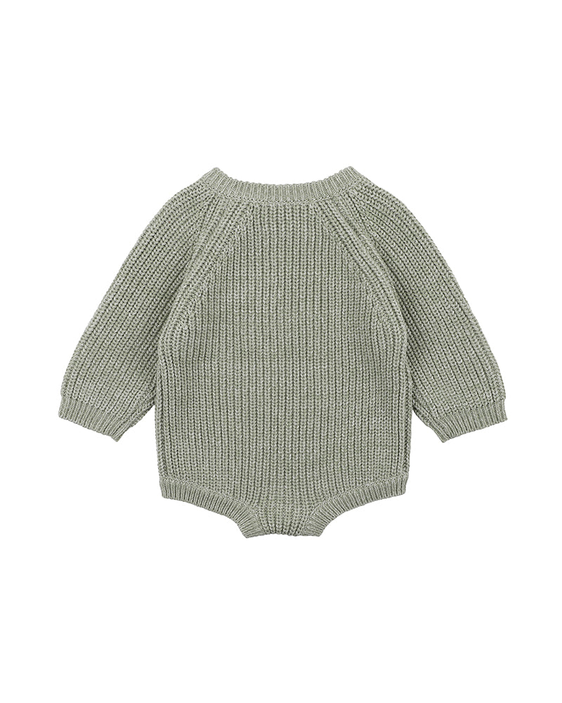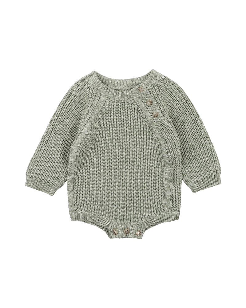 This gorgeous green marl fisherman’s rib knitted romper features a side front neck and crotch button opening and is a classic piece for your little one’s winter wardrobe.-Garment photographed in size 00 (3-6mth)