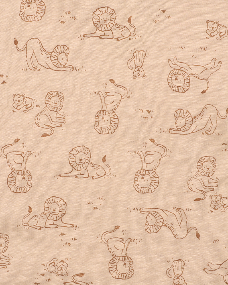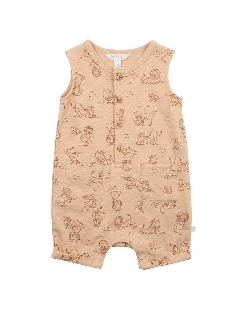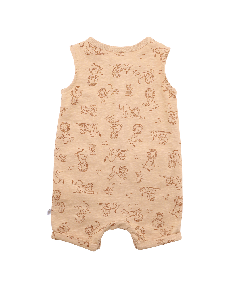 This cute cotton slub jersey monochromatic lion print sleeveless romper features a front button placket, contrast neck bind, rolled hem cuffs, front patch pockets and a concealed press stud crotch opening for ease of dressing your little one.