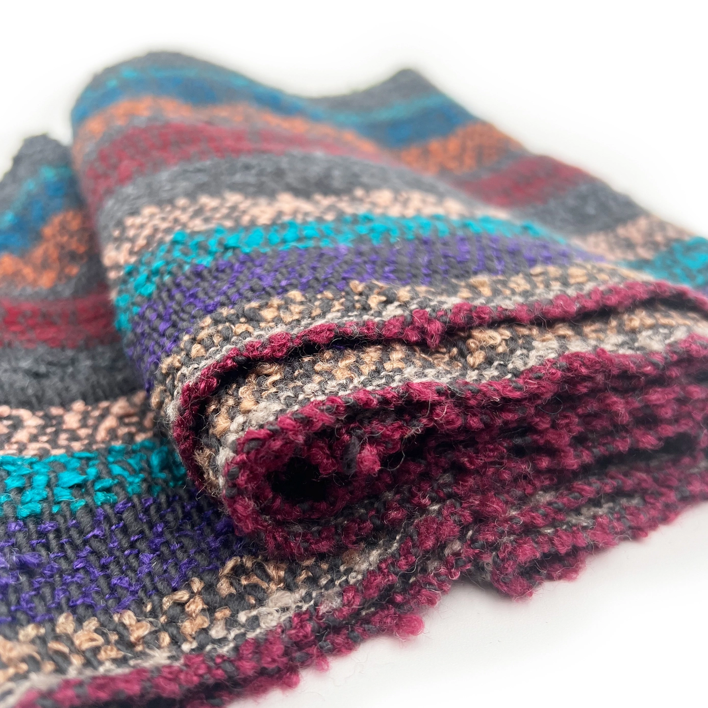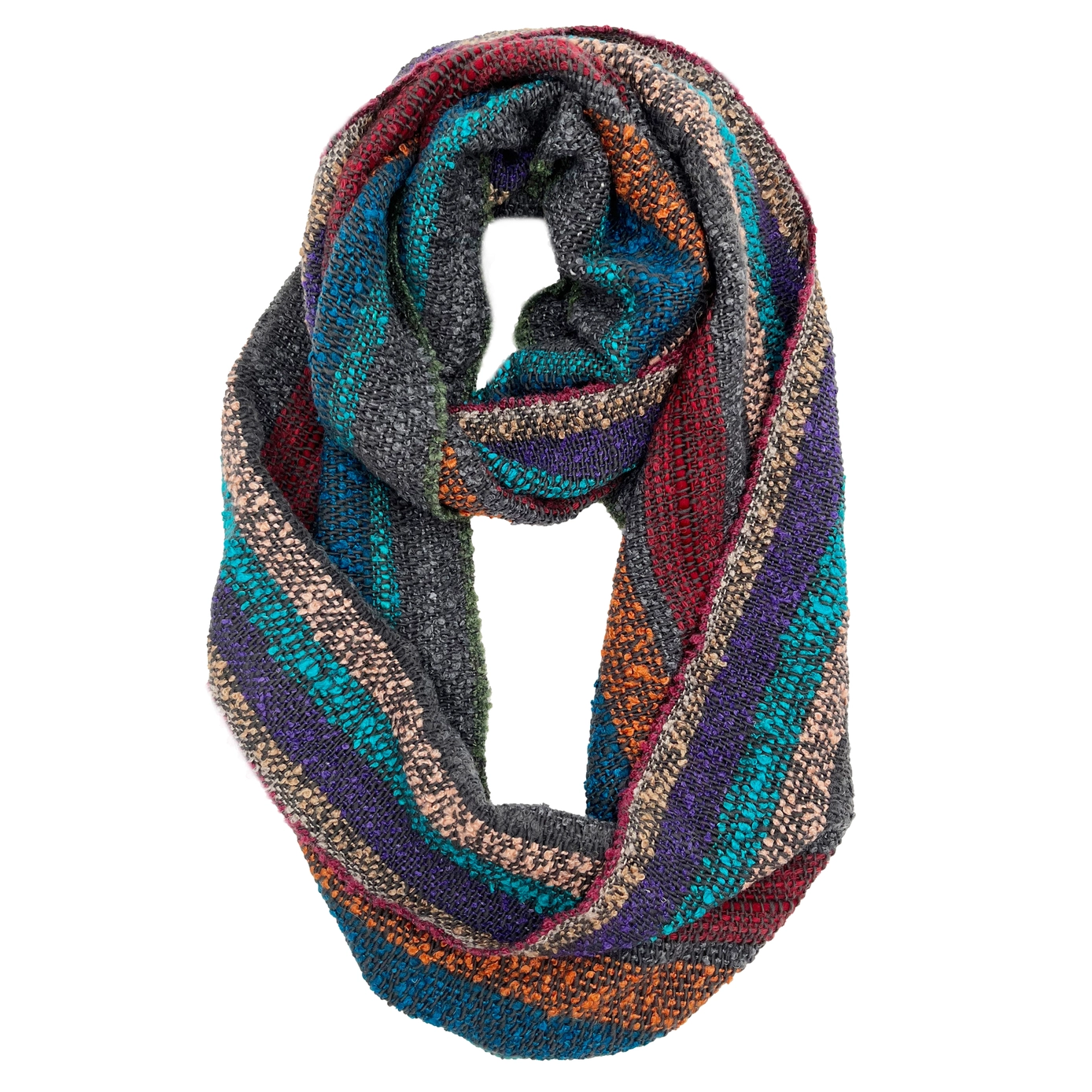 Relish in the warmth of fall festivities with this Eucalyptus Infinity Scarf, adorned with vibrant hues like teal, peach, orange, and red that peek through a base of neutral tones. Made with a sumptuous blend of alpaca and nylon and crafted with artisan-made boucle yarn, this scarf offers unparalleled softness and warmth.
