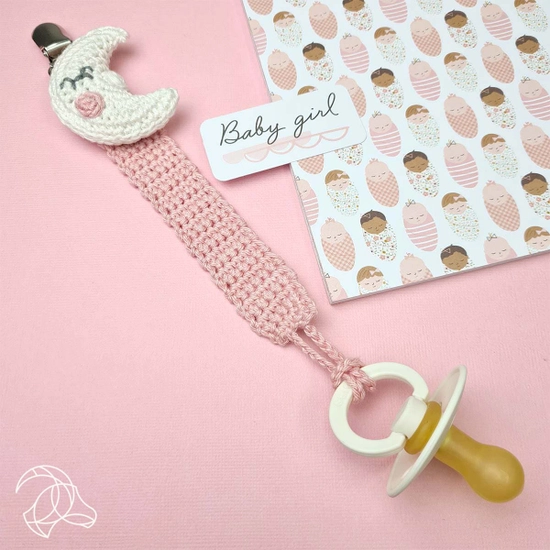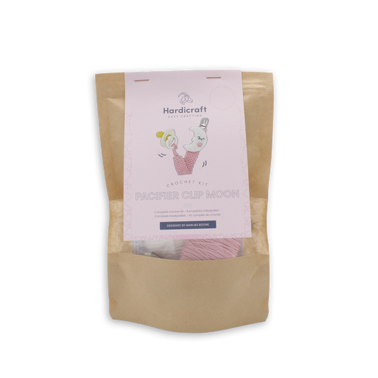 Add a personal touch to your baby gift by crocheting a pacifier clip! This kit contains a pattern, quality 100% cotton yarn, and all of the materials needed to get to work (excl. crochet hook). The Pacifier Clip Moon is approximately 24 cm long (clip and loop included) and is made with a 2.5 mm crochet hook. Pacifier not included.