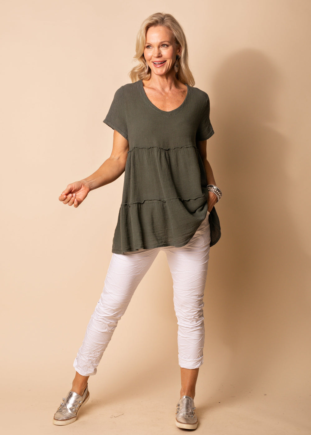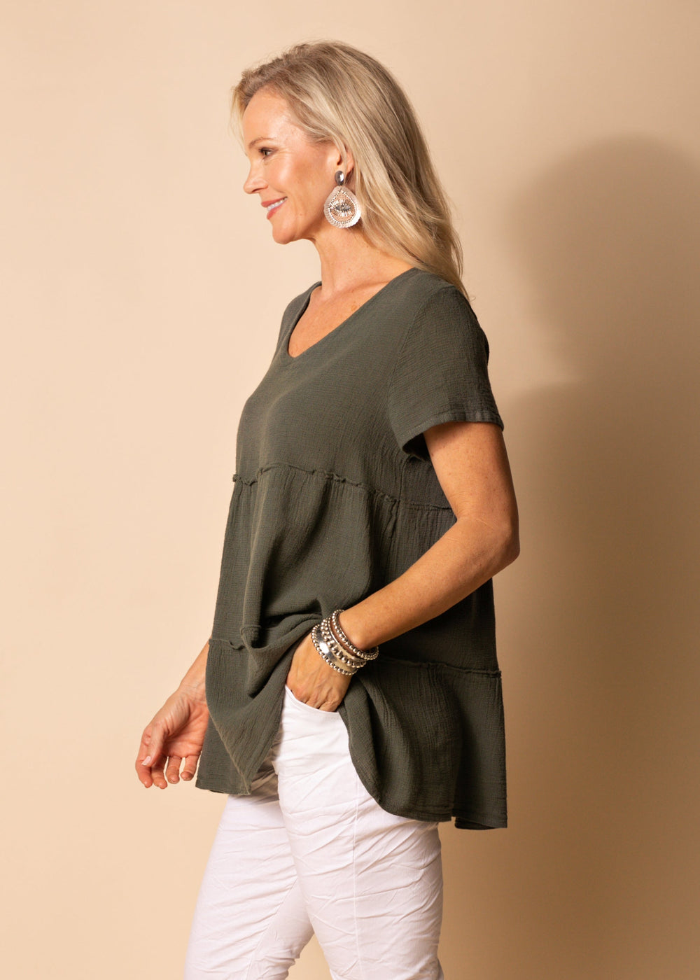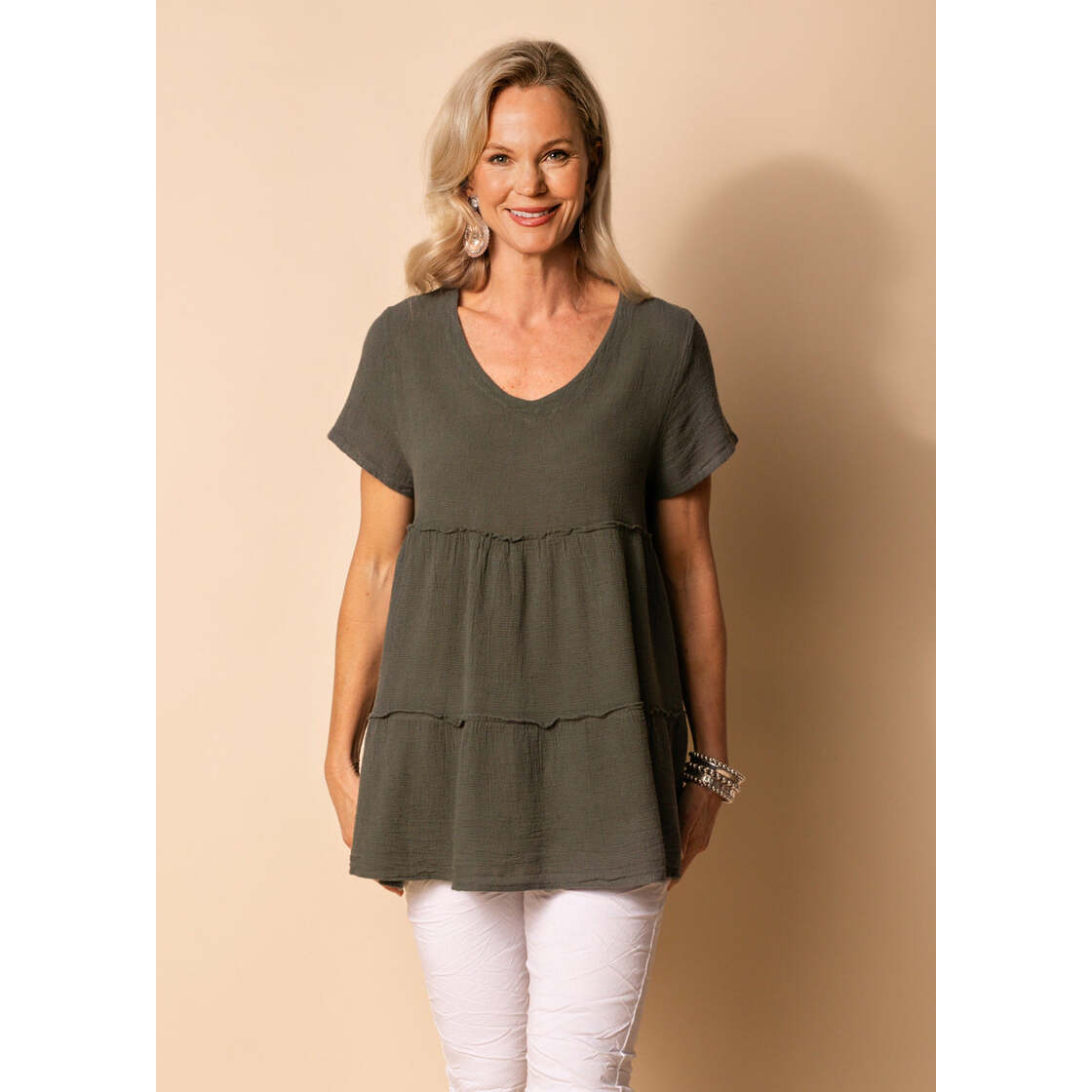 Imagine Fashion Nessa Linen Cotton V Neck Top Khaki