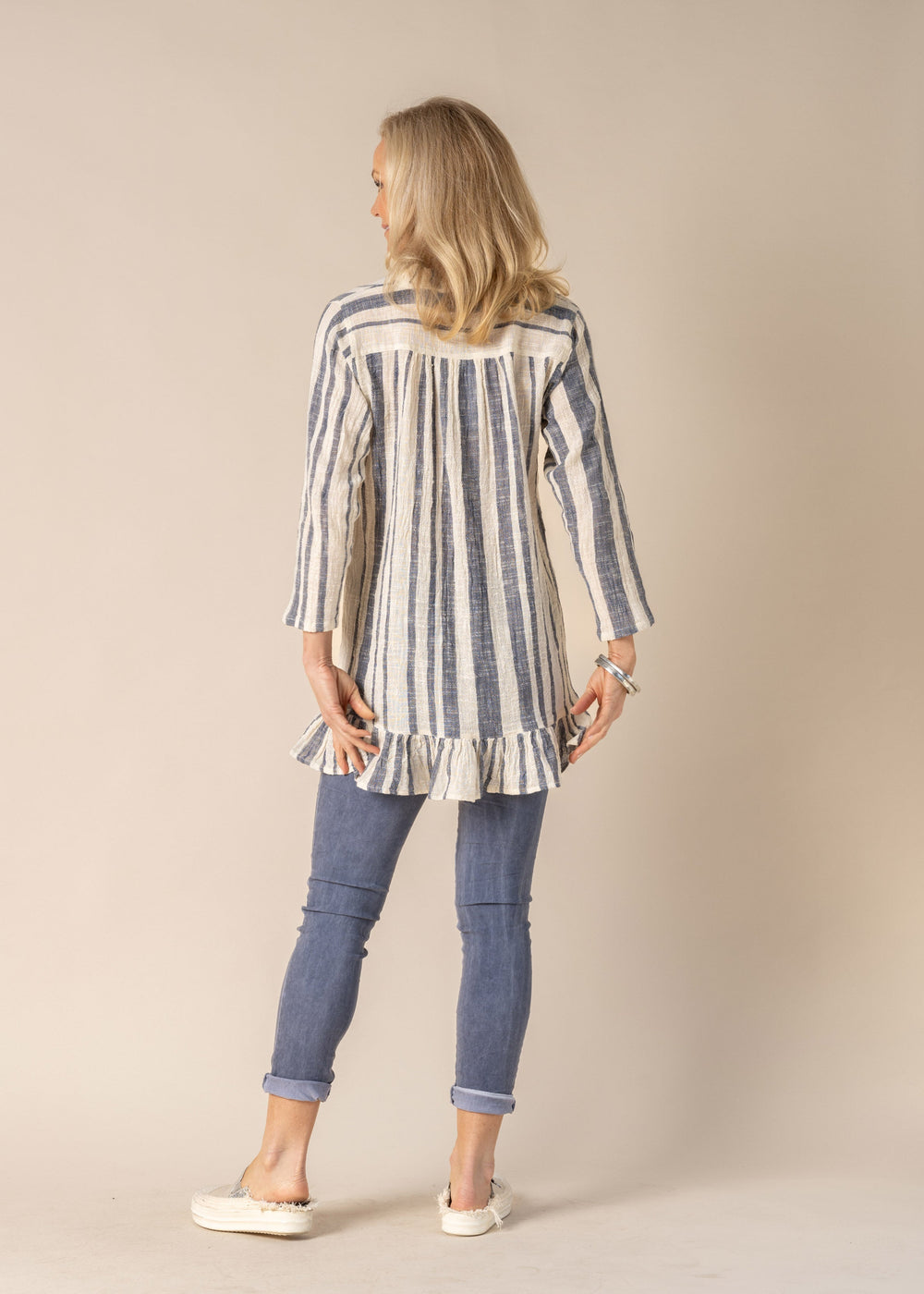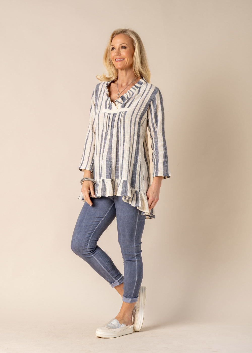 The Nyah top is a stylish blend of feminine charm and contemporary design. Made in a beautiful textured fabric, featuring a flattering V-neckline which is adorned with a delicate frill, on the half-yoke with pin tucks , adding a touch of elegant detailing further enhances the sophisticated look, while the frill on the hem and the long sleeves bring a playful yet polished vibe. The denim and cream stripe pattern adds a modern twist, making it a versatile piece for any occasion. With its flattering hi-low hem, the Nyah top offers both style and comfort, perfect for pairing with your favourite jeans or skirts.