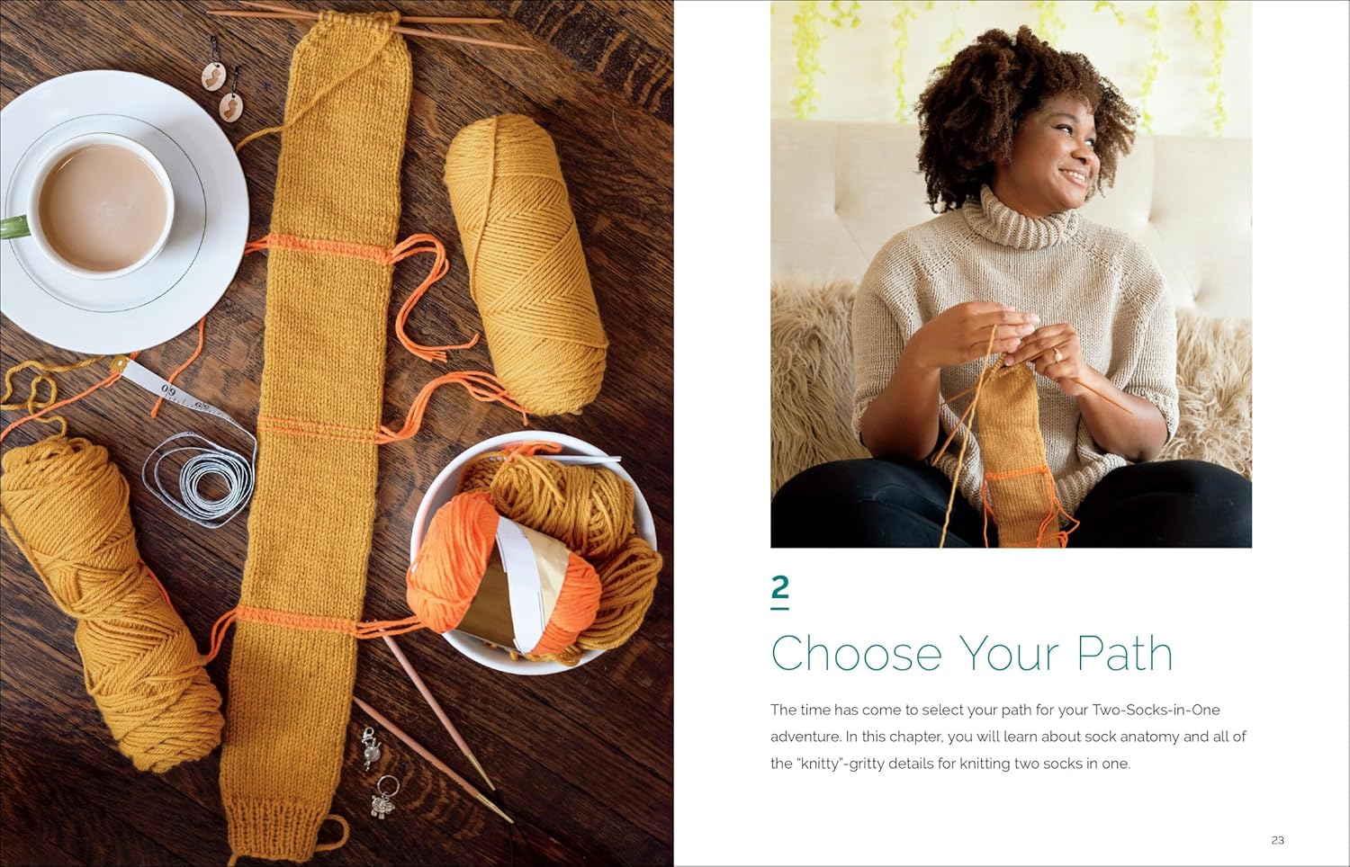 Knitters of all levels can take on the challenge of knitting two socks at once with the innovative Knit 2 Socks in 1 method, a simple technique for producing two socks through one continuous process, with 21 different style options.