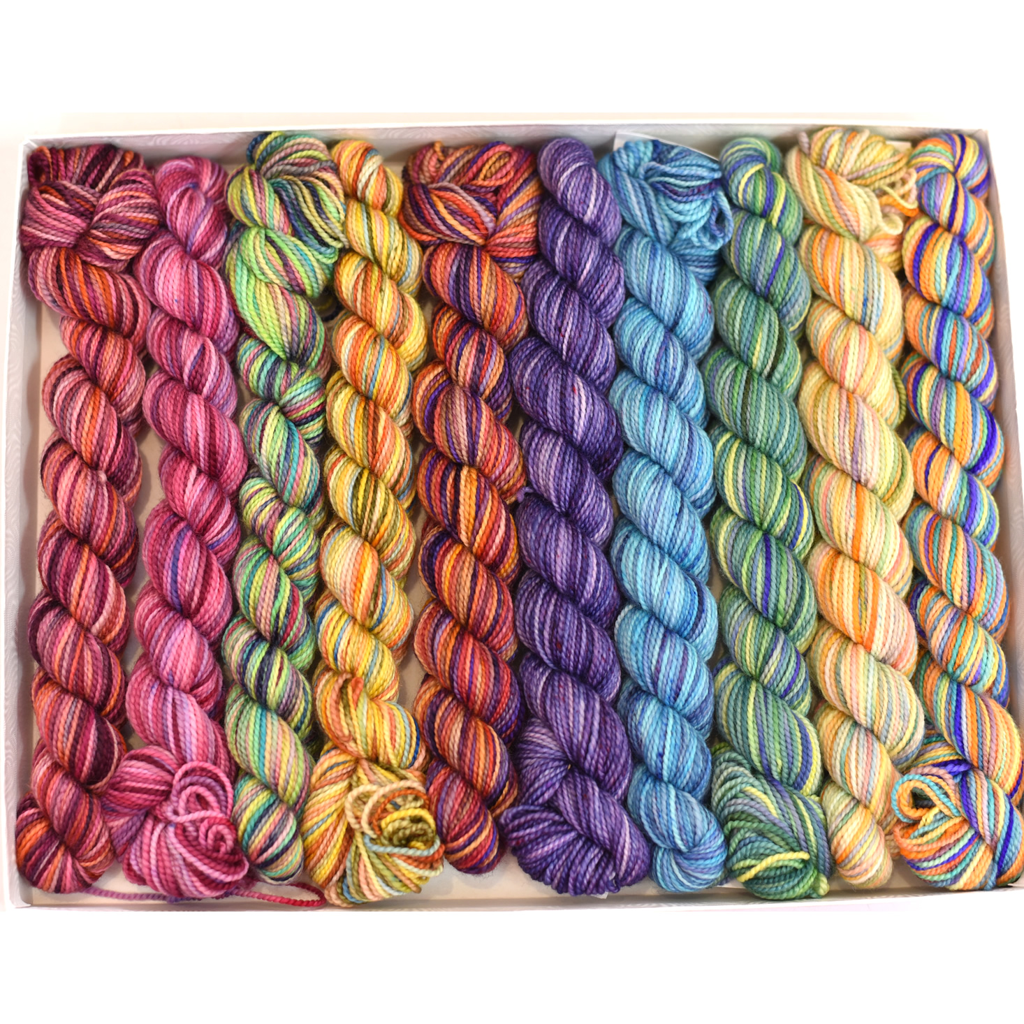 A Pencil Box, features 10 different colours in 25g skeins, specially curated by the women at Koigu. There are many ways that one can utilise the 250g, whether that be as a project, trim, to add little bits of extra colour or further variation of colour.