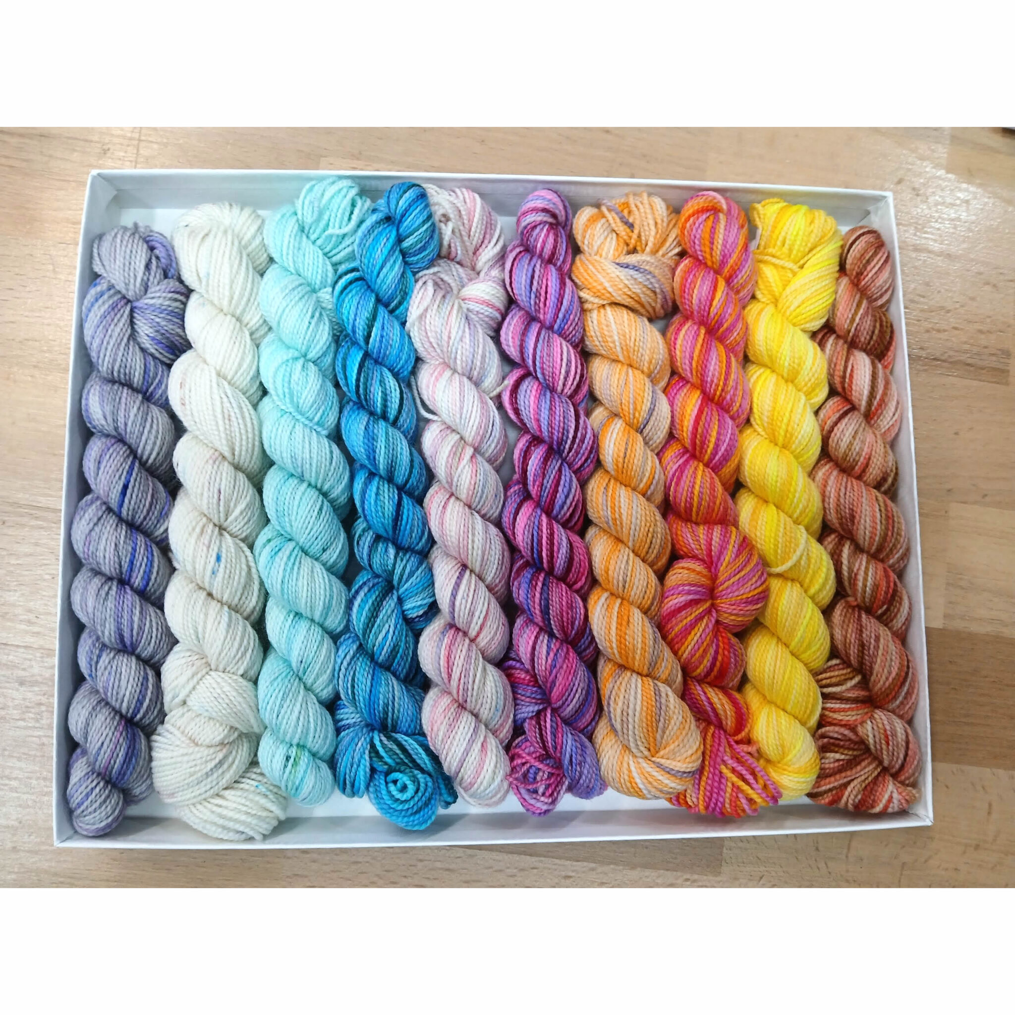 A Pencil Box, features 10 different colours in 25g skeins, specially curated by the women at Koigu. There are many ways that one can utilise the 250g, whether that be as a project, trim, to add little bits of extra colour or further variation of colour.