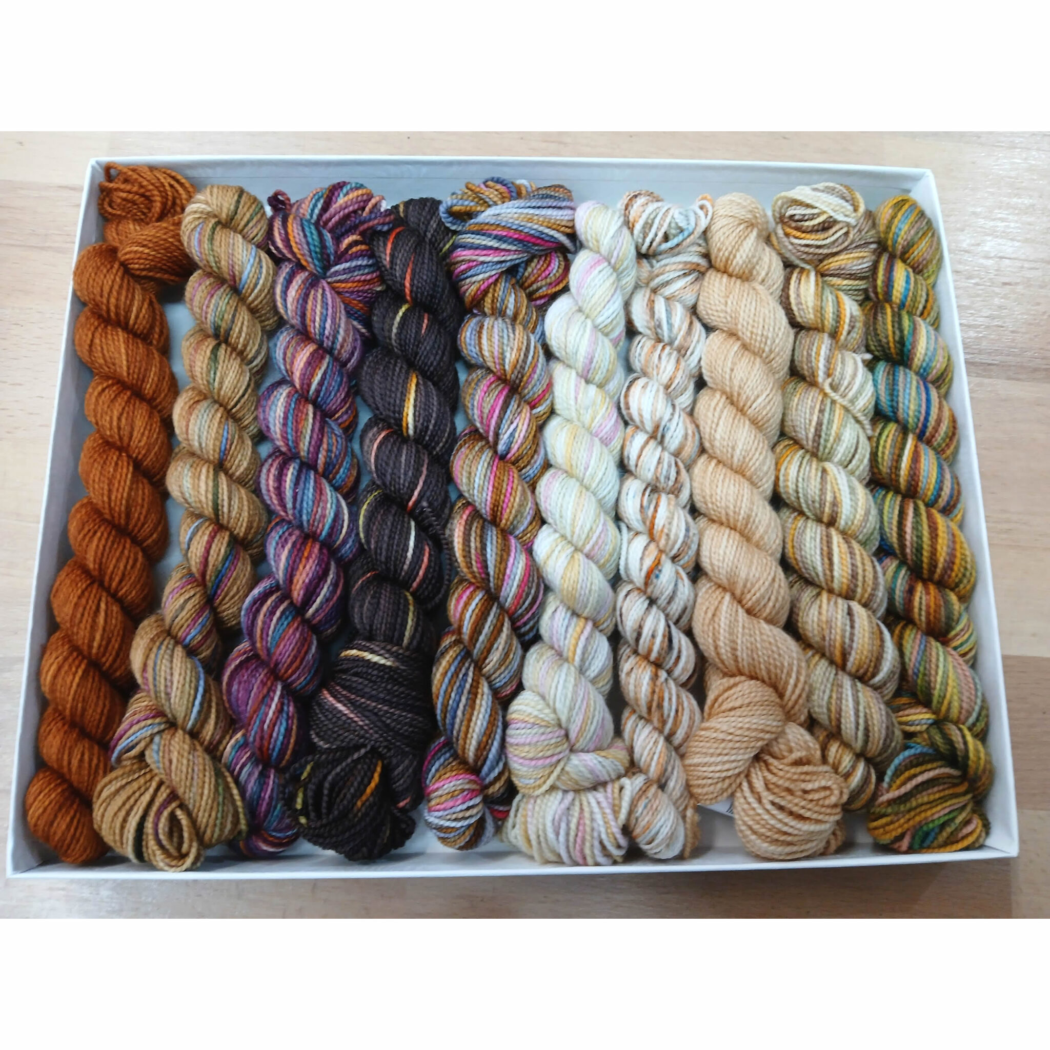 A Pencil Box, features 10 different colours in 25g skeins, specially curated by the women at Koigu. There are many ways that one can utilize the 250g(870yds), whether that be as a project, trim, to add little bits of extra colour or further variation of colour.