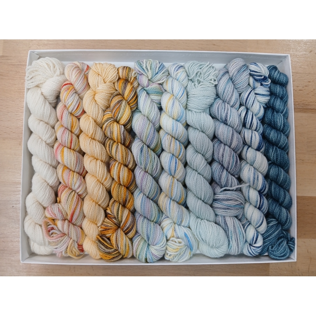 A Pencil Box, features 10 different colours in 25g skeins, specially curated by the women at Koigu. There are many ways that one can utilise the 250g, whether that be as a project, trim, to add little bits of extra colour or further variation of colour.