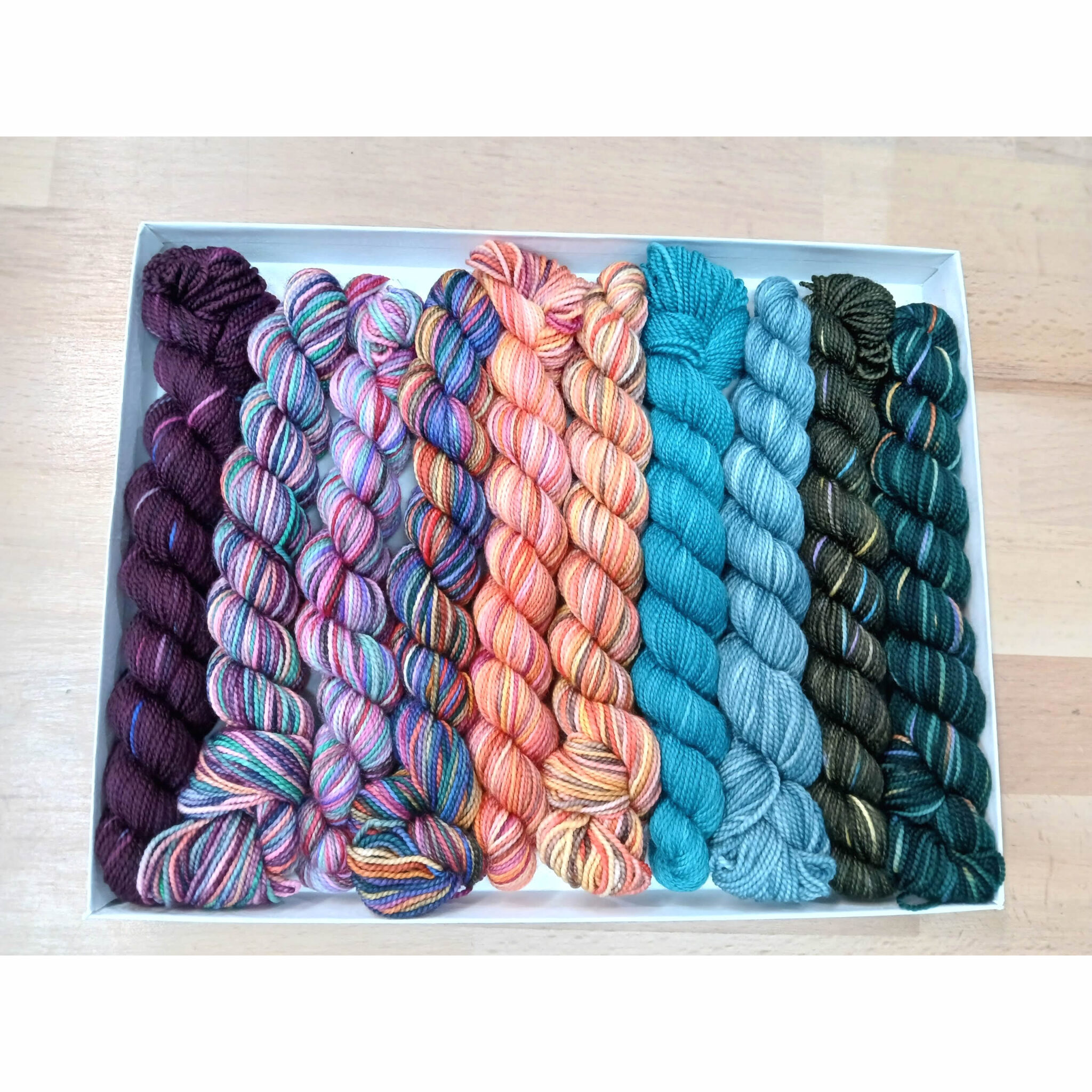 A Pencil Box, features 10 different colours in 25g skeins, specially curated by the women at Koigu. There are many ways that one can utilise the 250g, whether that be as a project, trim, to add little bits of extra colour or further variation of colour.
