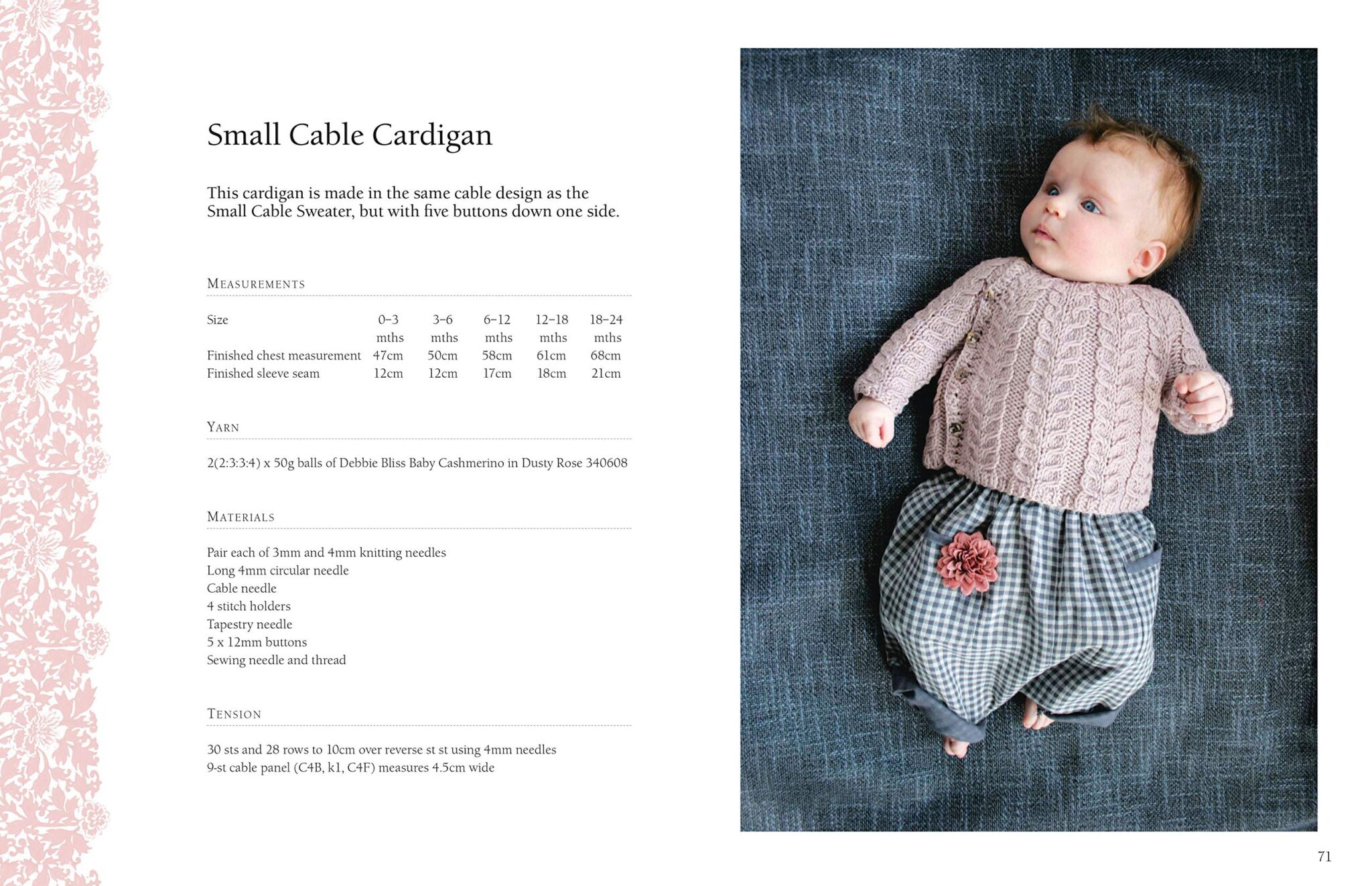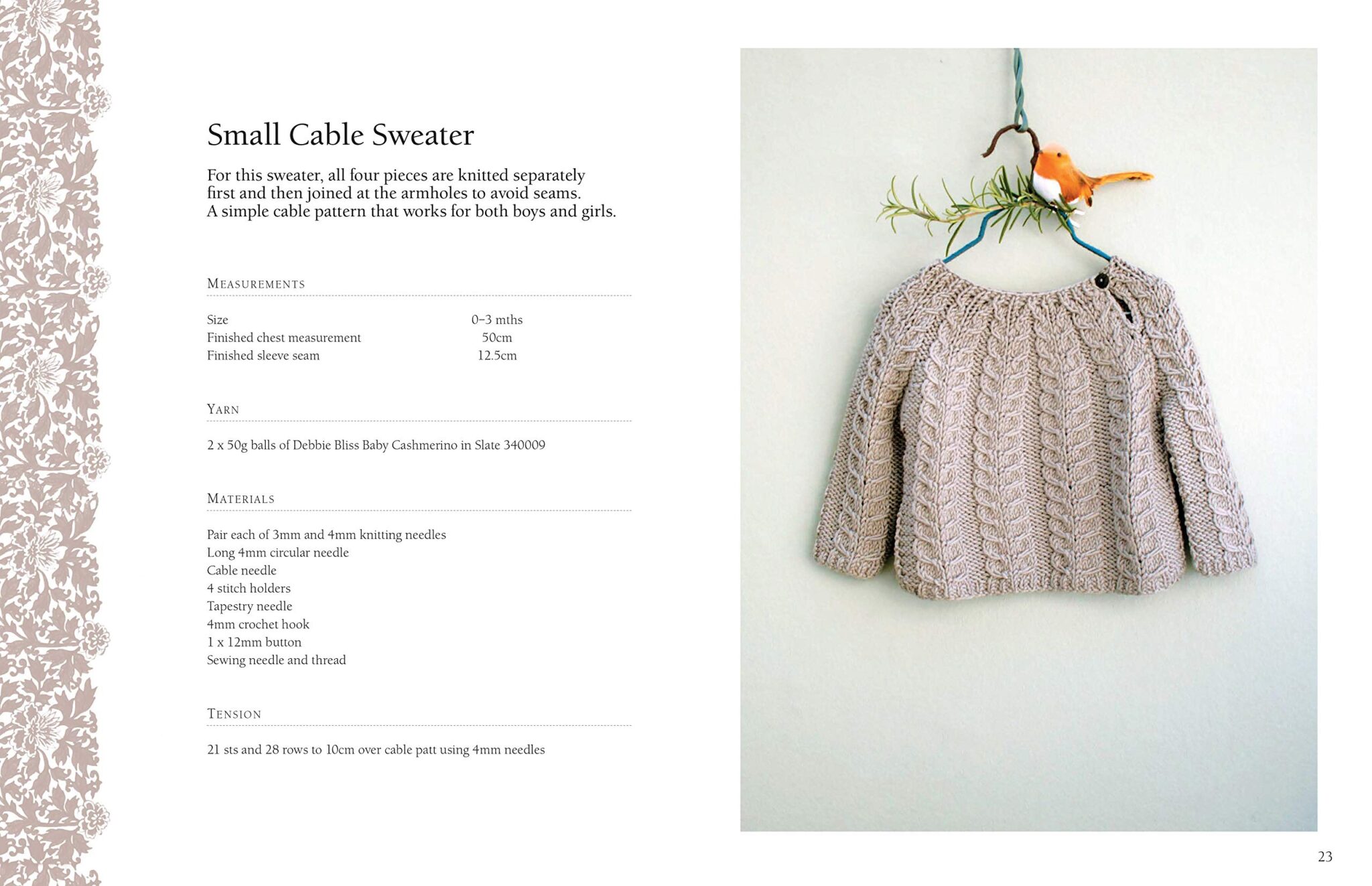 Many of the designs focus on texture and shape in solid colours, and all aim to be comfortable for babies. Beautiful stitches, quirky details, classic shapes and lush yarns are combined to inspire others to create their own unique garments and accessories.