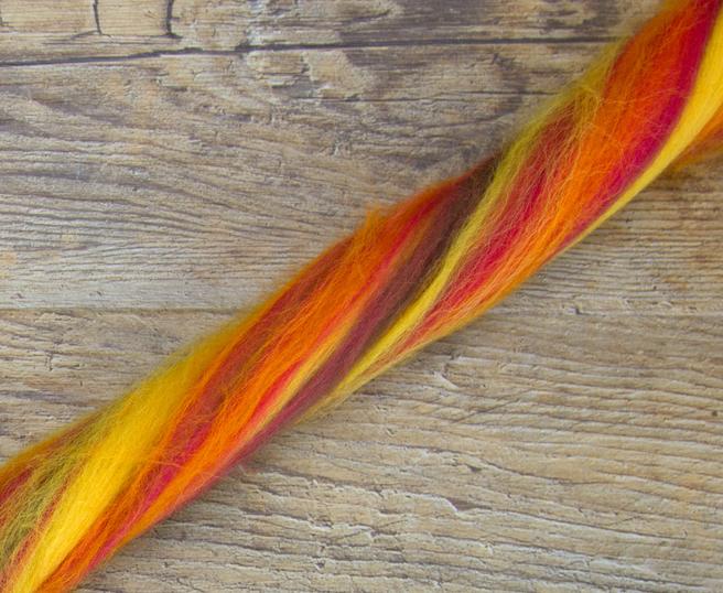 fun and strong fibre to spin, fantastic for a beginner spinner. spins up into a happy speckely orange, with visual effect of tweed. low-medium itch factor. Can be used for sock yarn, jumpers and felting projects